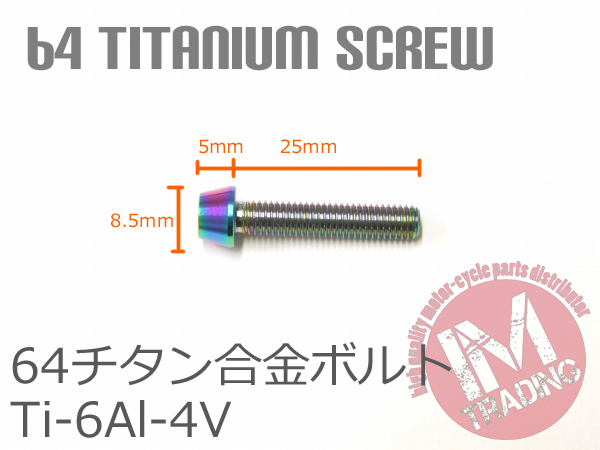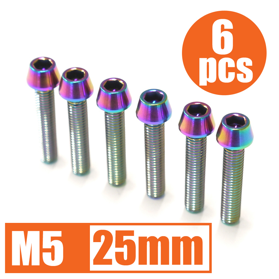 64チタン合金ボルト M5×25mm P0.8 6本セット テーパーキャップ ゆうパケット対応 焼き色有り Ti-6Al-4V