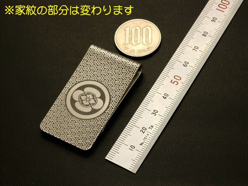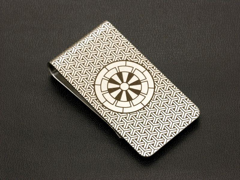 源氏車 (げんじぐるま) の家紋入りマネークリップです。(家紋の変更可)