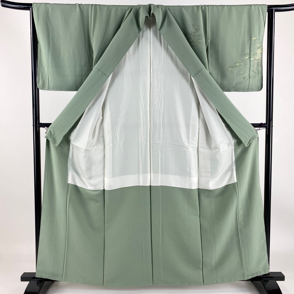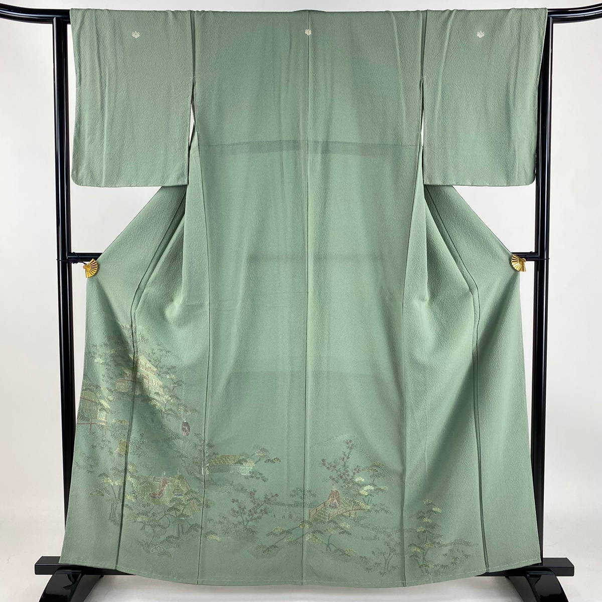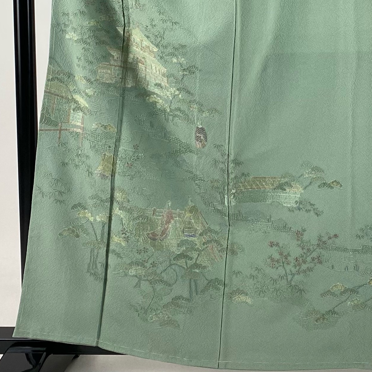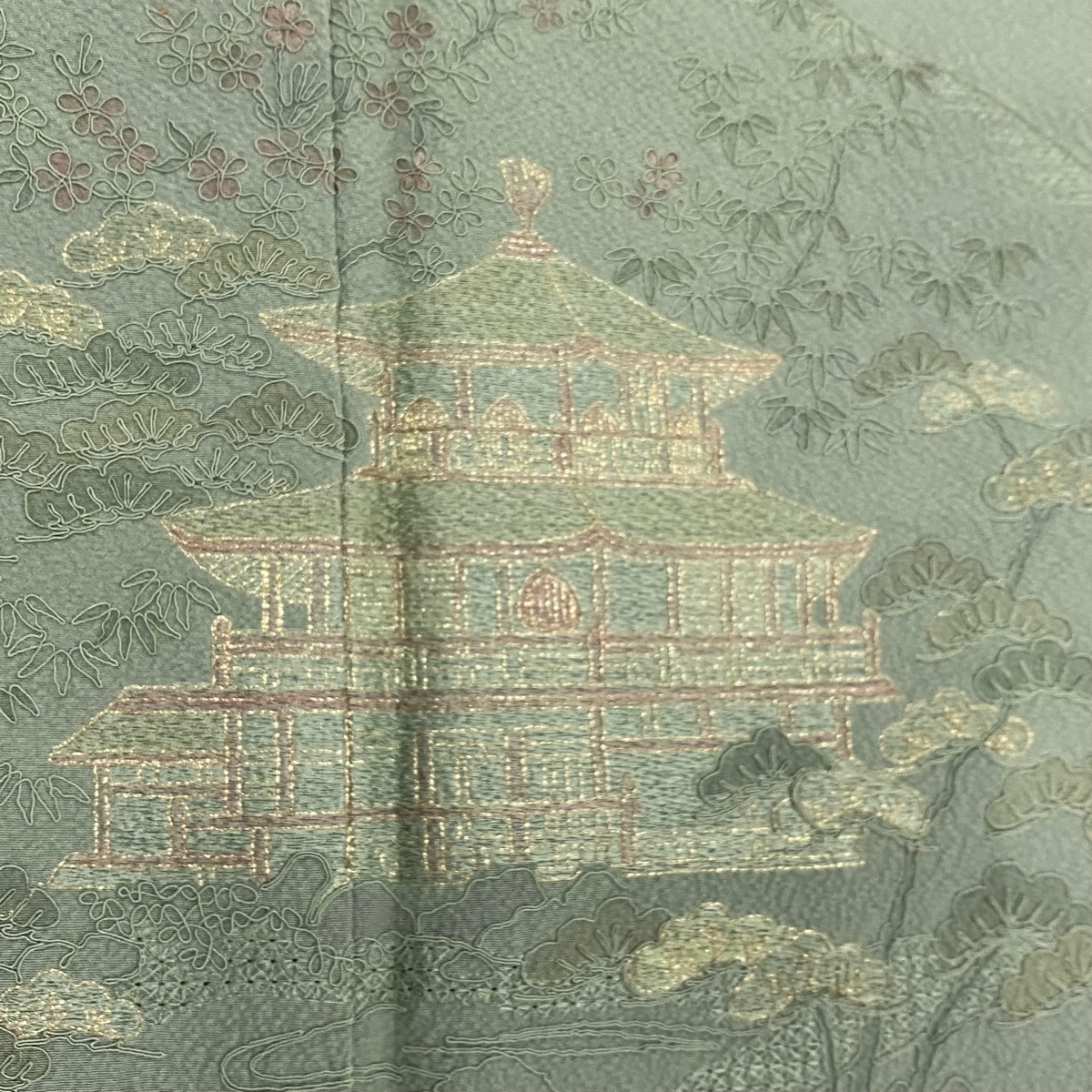 | 付下げ 秀品 建物 松竹梅 刺繍 金糸 薄緑 袷 身丈160.5 裄丈64 M 正絹 【中古】 |