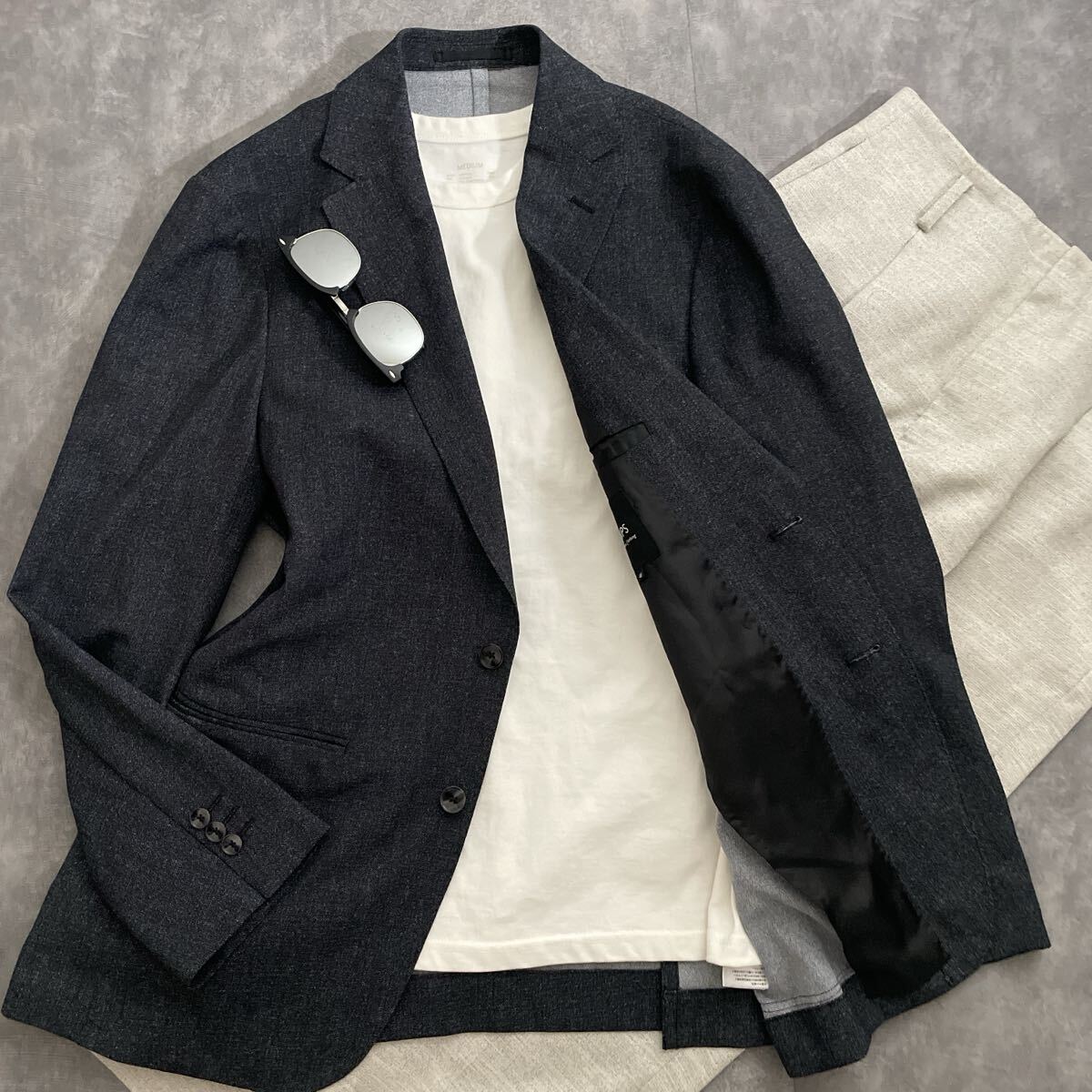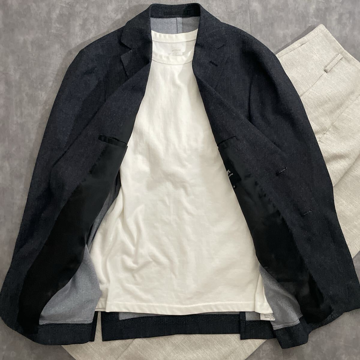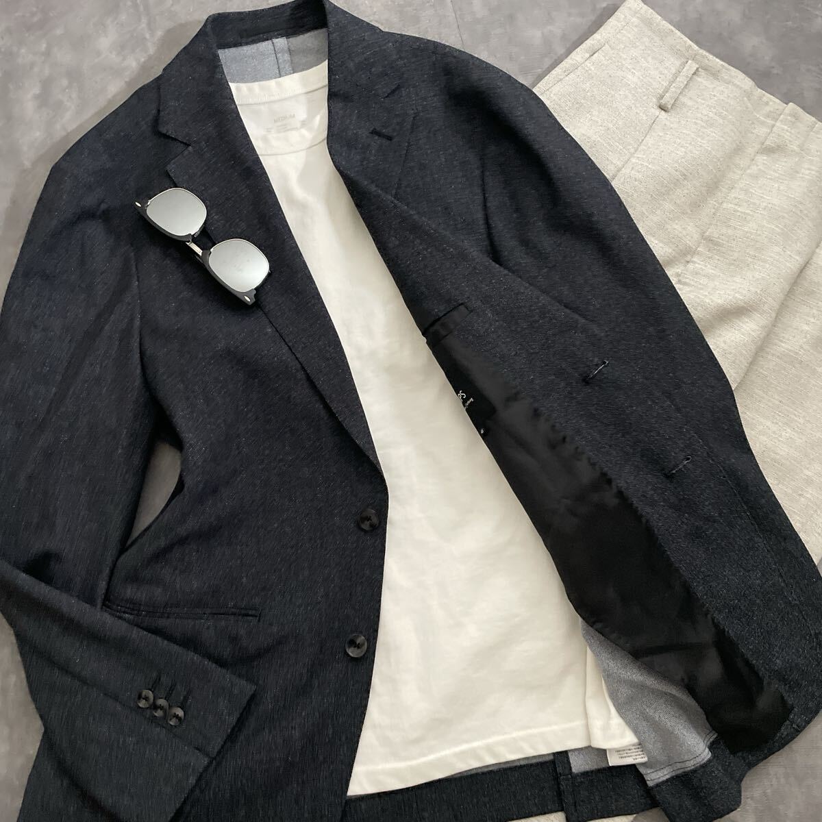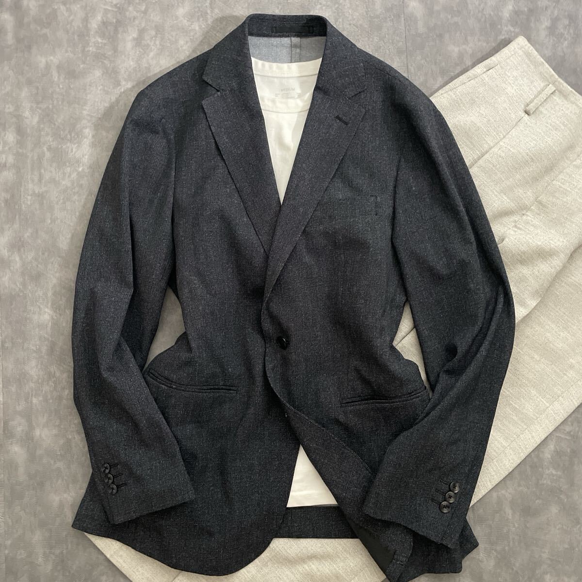 ビジネスシーンだけでなく、Tシャツやデニムと合わせてジャケパンスタイルにも最適。