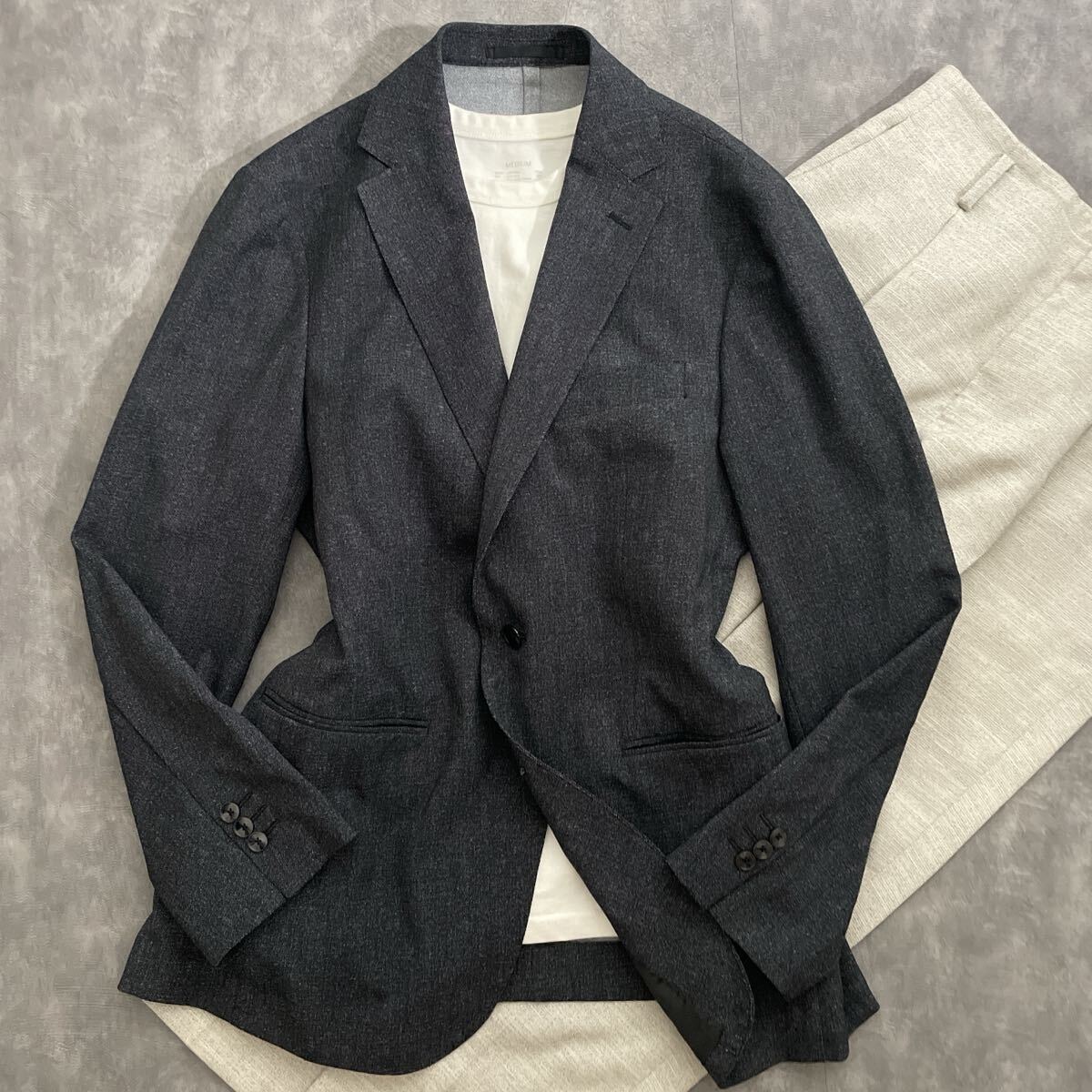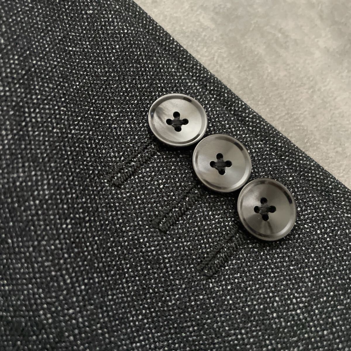 シックなダークグレーメランジ調の生地感で、ポリエステル100%ながら上品な風合いと軽さを兼備。