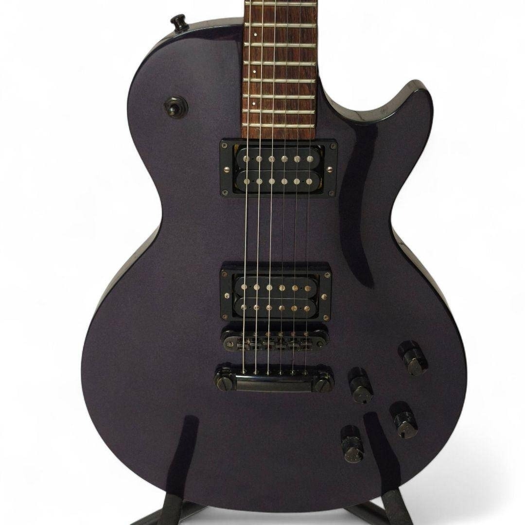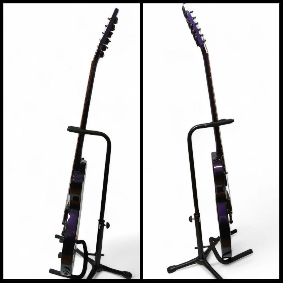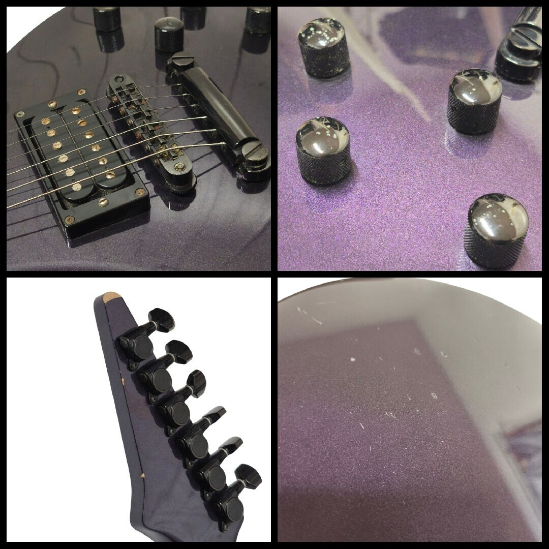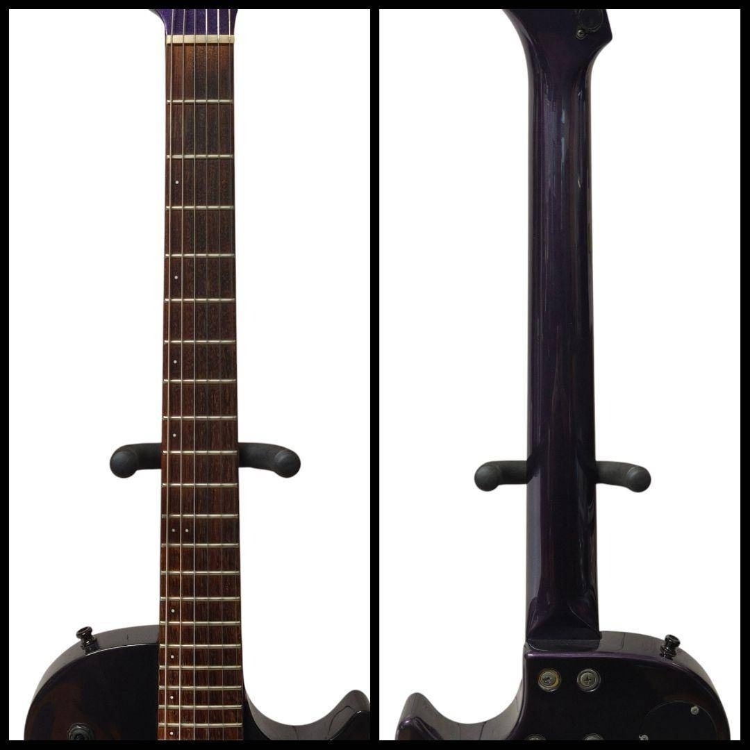 厚さ約40mmのレスポールタイプの薄胴ボディに、パープル系シースルーカラーが映える希少なギターです。