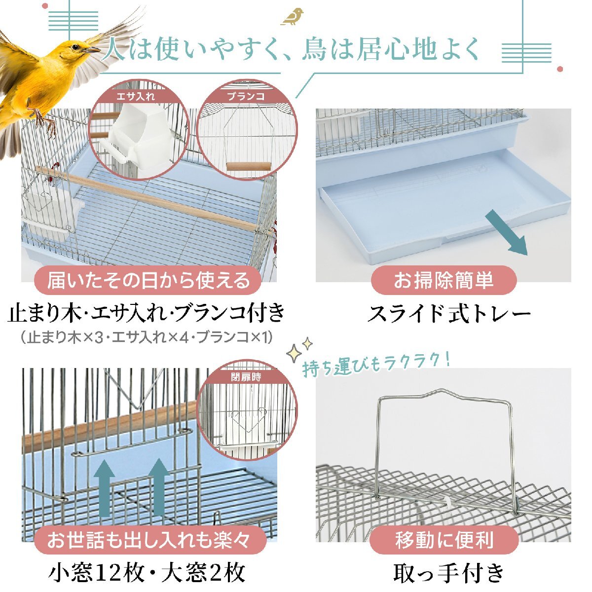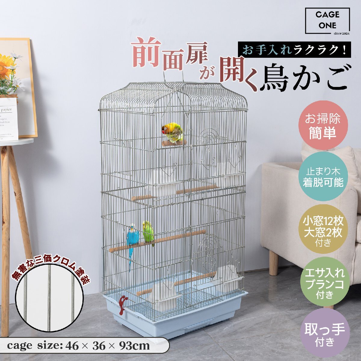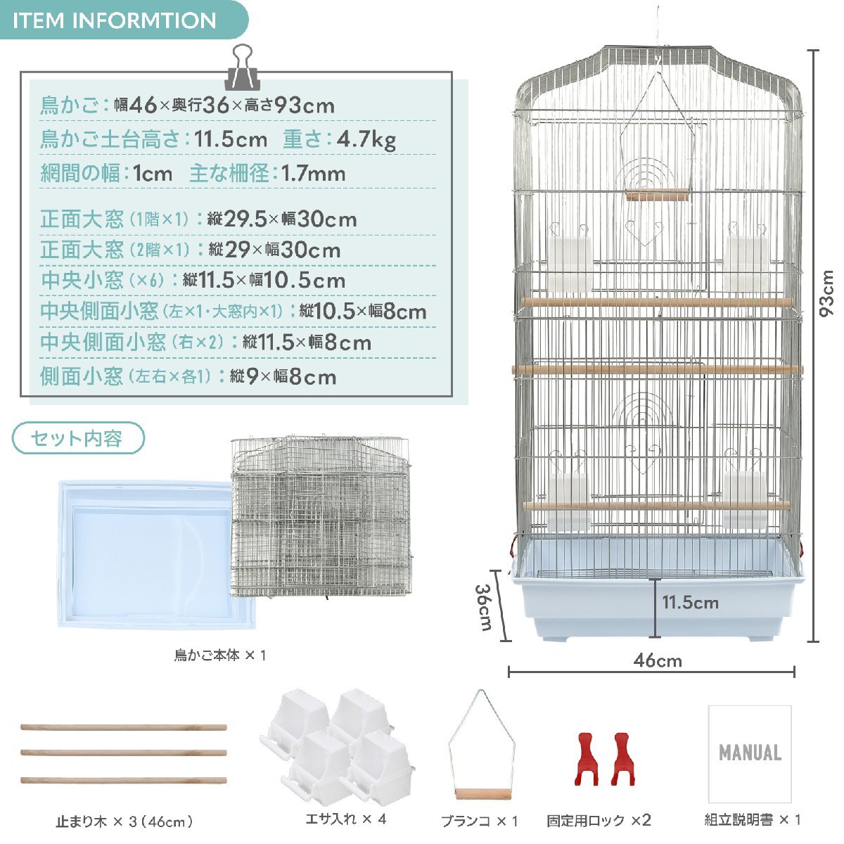 | 商品名:鳥かご バードケージ 鳥小屋 複数飼い 大きいケージ 大型 インコ セキセイインコ オカメインコ 文鳥 小鳥 ケージ ゲージ 93×46×36cm 底網付きで、トレーは引き出し式のため掃除がカンタン。 カナリヤやセキセイインコなどの小鳥の多数飼育でも広々。オカメインコなどでもたくさん飼育できます。 安全性を考慮して、表面の塗装には亜鉛メッキ後の処理に鳥や動物に無害な三価クロムを使用しております。 4つのプラスチック製エサ入れと3本の木製止まり木、ブランコ、 2枚の大窓で鳥の出し入れがしやすく、隅々までお掃除可能! 12枚の小窓で小物の配置も自由自在。 持ち手付きでお手軽に移動できます。 組立説明書をお付けいたしますので簡単にご使用いただけます。 ●製品仕様 サイズ(約):高さ93×幅46×奥行き36cm、 重さ4.7kg 付属品: 鳥かご本体(スチール製) トレー(プラスチック) 止まり木:3本 プラスチック製のエサ(水)入れ:4個 ブランコ:1個 固定用ロック:2個 組み立て説明書 |