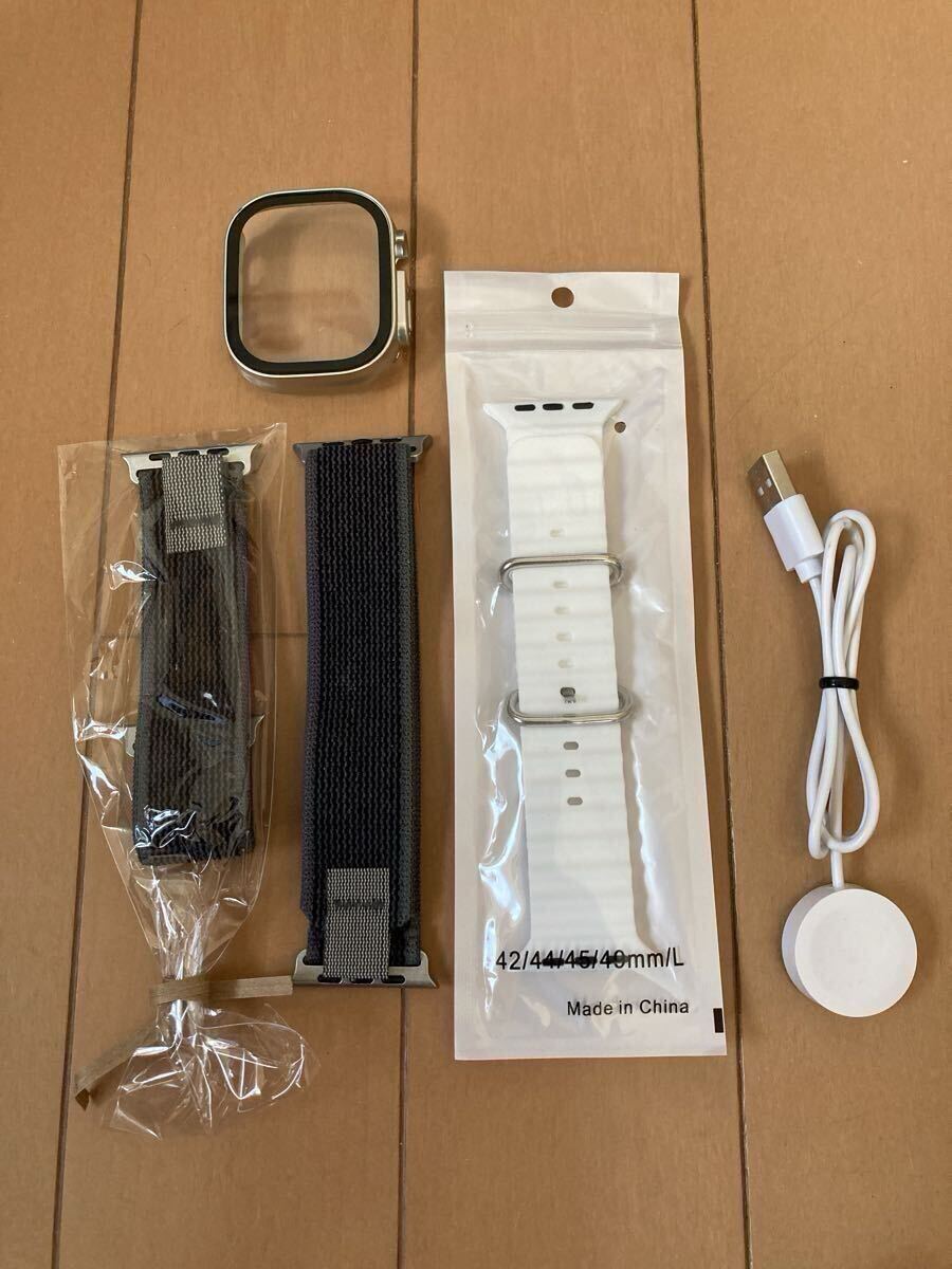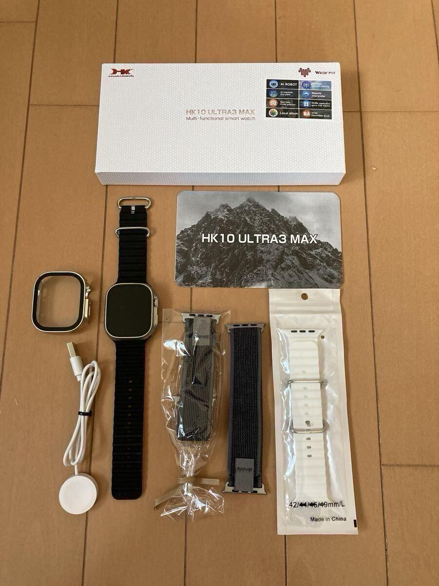 HK10 ULTRA3MAX スマートウォッチ(日本語対応) 本体シルバー バンド4本付き 「ULTRA3」シリーズの最新モデルが登場! 日常生活のスマートなサポーターとして、健康管理や便利な機能が充実! 【注目ポイント】 新搭載!AIチャットボット機能 文字盤に常駐するロボットアイコンをタップするだけで、ChatGPTベースのAIとすぐに会話可能! ちょっとした質問や翻訳もできて旅行や仕事にも便利。 高画質AMOLEDディスプレイ(2.12インチ / 解像度485×520) 省エネ&明るく鮮やかな表示で、日差しの中でも見やすい! 完全日本語対応 メニュー、通知、アプリすべて日本語で表示。SNS通知(LINE、Instagram、Gmail、Xなど)も日本語対応。 Bluetoothネットワーク機能搭載 デザリング接続でウォッチ単体からアプリやゲームをダウンロード可能。 ワイヤレス充電対応 ケーブル不要で置くだけ充電! Apple Watchバンド互換(42/44/45mm) お気に入りのバンドと組み合わせ可能。ベルトストッパー付きで安定感あり。 ヘルスケアセンサー搭載 心拍数、血圧、血中酸素、睡眠モニター(※医療用ではありません) 【仕様】 ・本体サイズ:49×44×12mm ・画面サイズ:2.12インチ AMOLED ・バッテリー容量:260mAh ・Bluetooth接続時:約2~4日 ・非接続時:約5~7日 ・対応アプリ:Wearfit Pro(日本語対応) 【機能まとめ】 ・AIチャット機能(ChatGPT) ・SNS・アプリ通知(日本語) ・Bluetooth通話/ハンズフリー対応 ・音声レコーダー/アニメーション待受け ・翻訳機能(外国語→日本語) ・運動記録モード ・ワイヤレスイヤホン操作対応 【付属品】 ①本体 ②ベルト×3 ③充電器(ワイヤレス) ④取扱説明書 【ご注意】 Apple Watchではありません