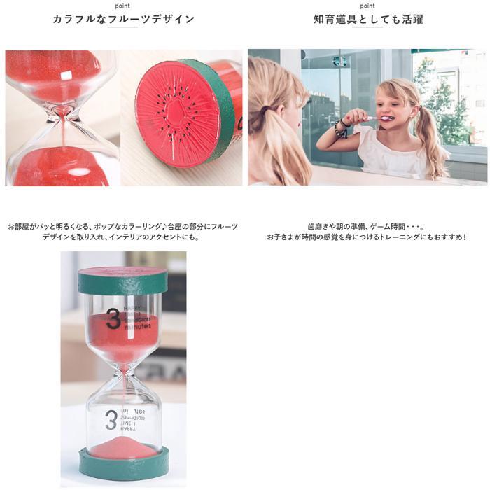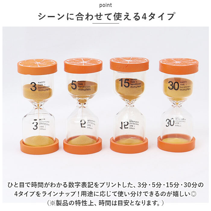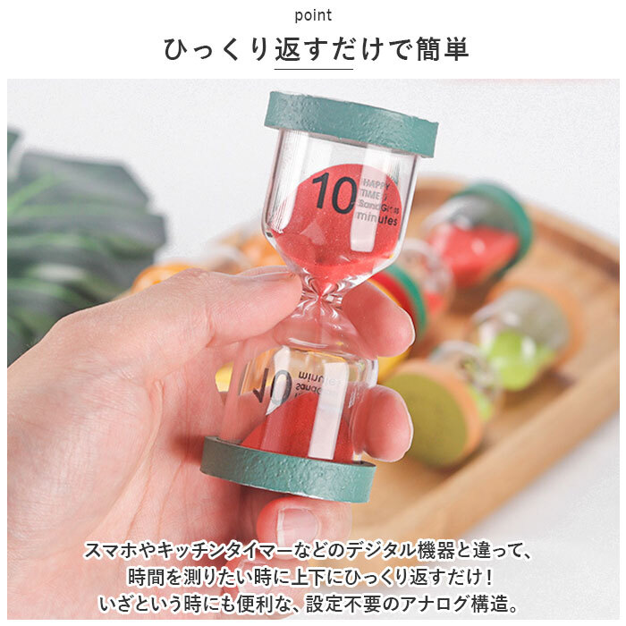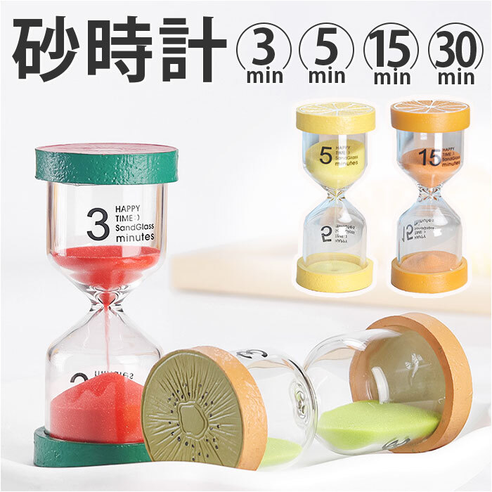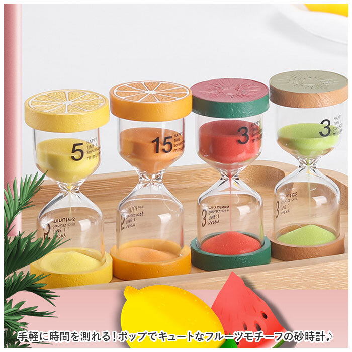 | 商品説明 | ・・手軽に時間を測れる!ポップでキュートなフルーツモチーフの砂時計♪ ・【ひっくり返すだけで簡単】 ・スマホやキッチンタイマーなどのデジタル機器と違って、時間を測りたい時に上下にひっくり返すだけ!いざという時にも便利な、設定不要のアナログ構造。 ・【シーンに合わせて使える4タイプ】 ・ひと目で時間がわかる数字表記をプリントした、3分・5分・15分・30分の4タイプをラインナップ!用途に応じて使い分けできるのが嬉しい◎(※製品の特性上、時間は目安となります。) ・【カラフルなフルーツデザイン】 ・お部屋がパッと明るくなる、ポップなカラーリング♪台座の部分にフルーツデザインを取り入れ、インテリアのアクセントにも。 ・【リラックスタイムのお供に】 ・ぼーっと眺めているだけで、ゆったりとした時間を感じさせてくれる!忙しい毎日の中に癒やしの時間を♪ ・【知育道具としても活躍】 ・歯磨きや朝の準備、ゲーム時間・・・。お子さまが時間の感覚を身につけるトレーニングにもおすすめ! |