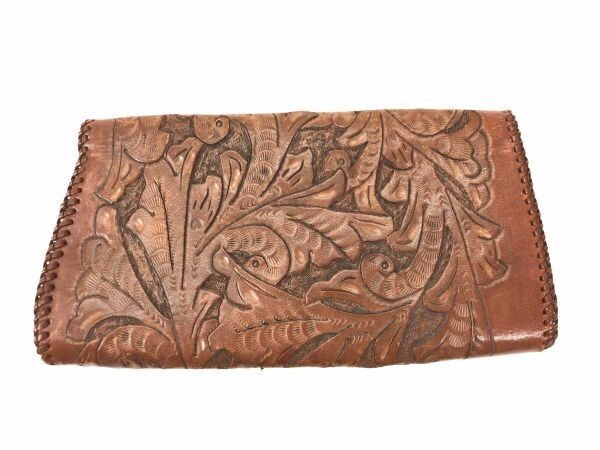 レトロ オールド エスニック ボヘミアン ボタニカル クラフト カービング レザー 本革 クラッチ バッグ 小物入れ レディース 茶色 です。