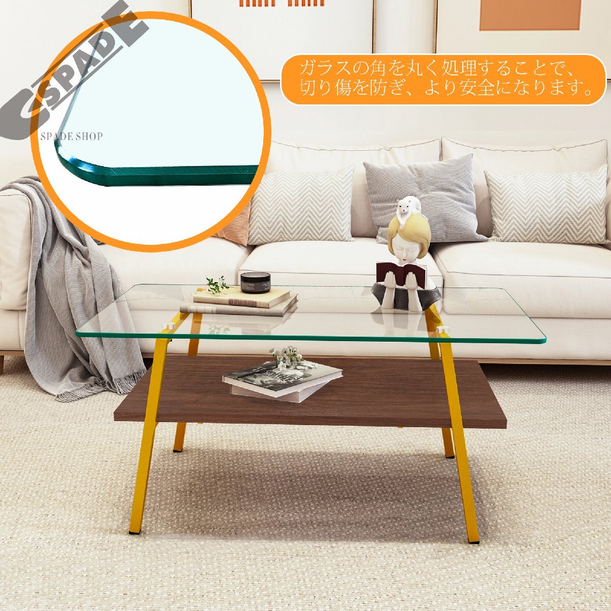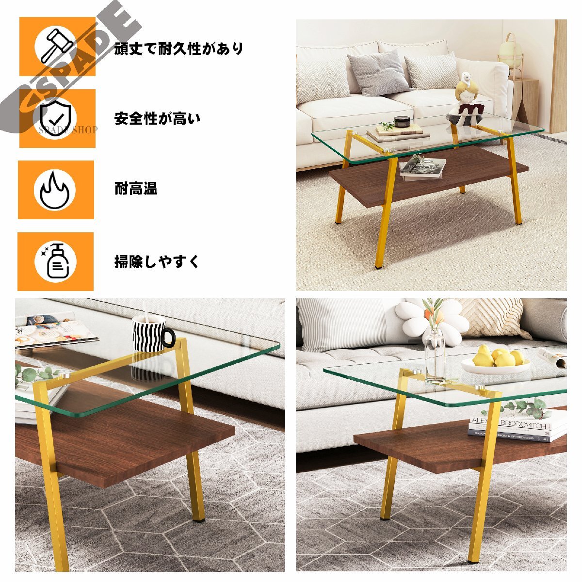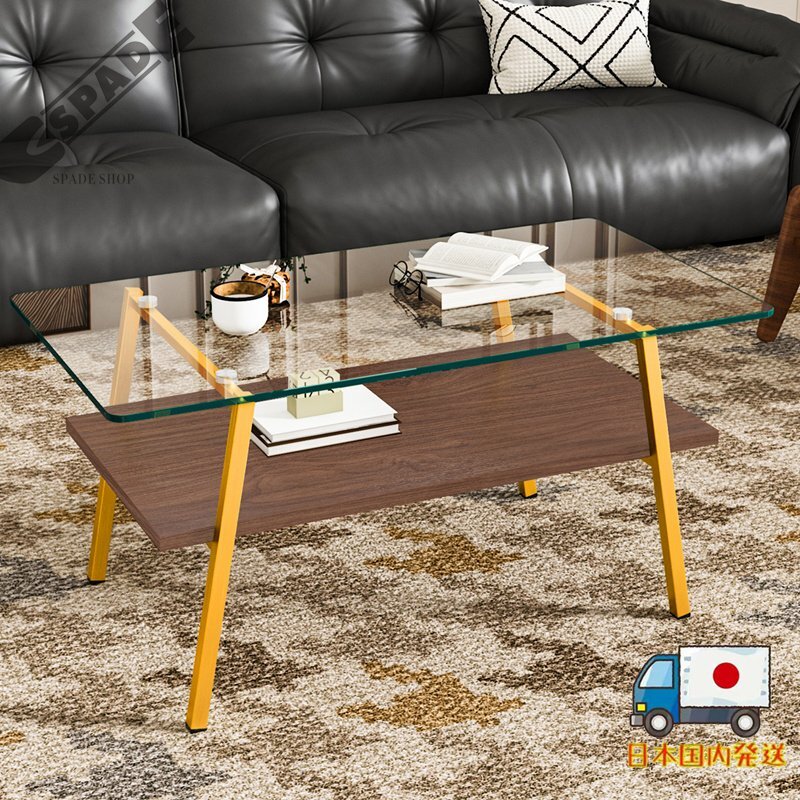 【国内発送】モダン長方形コーヒーテーブル 強化ガラス天板 + MDF収納棚 リビング用 透明ガラス + ゴールド脚