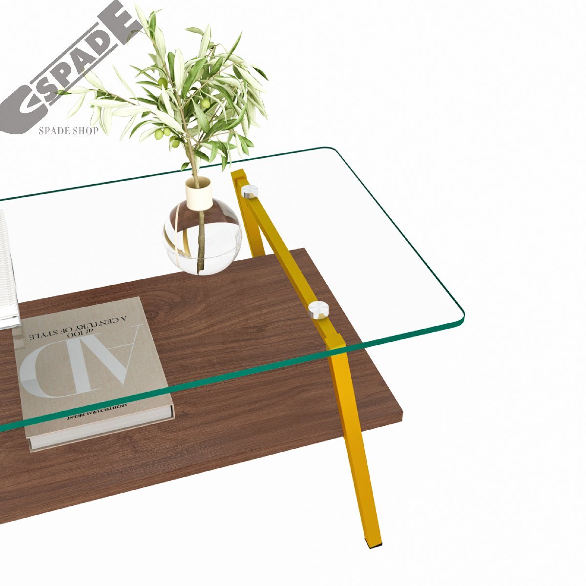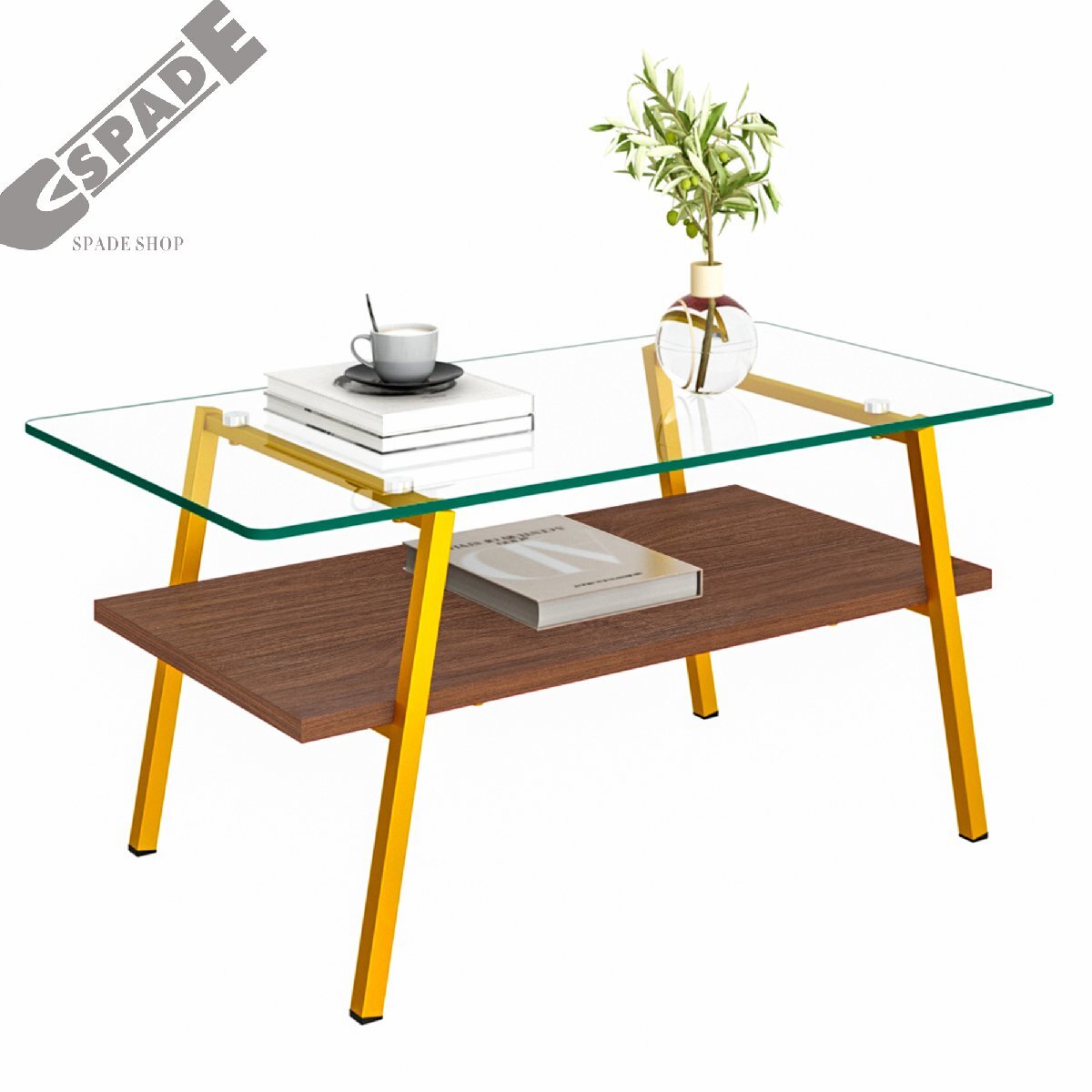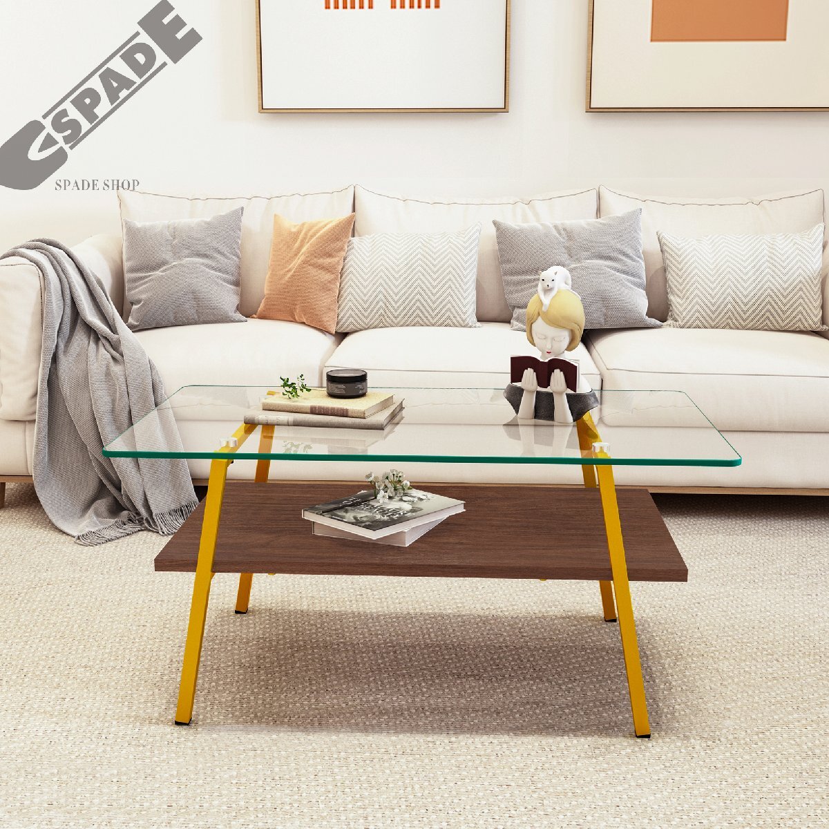 【国内発送】モダン長方形コーヒーテーブル 強化ガラス天板 + MDF収納棚 リビング用 透明ガラス + ゴールド脚