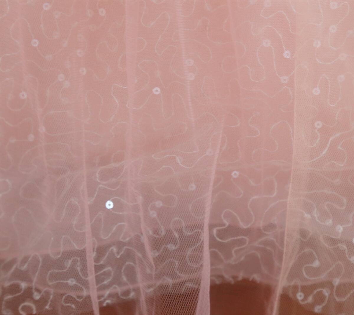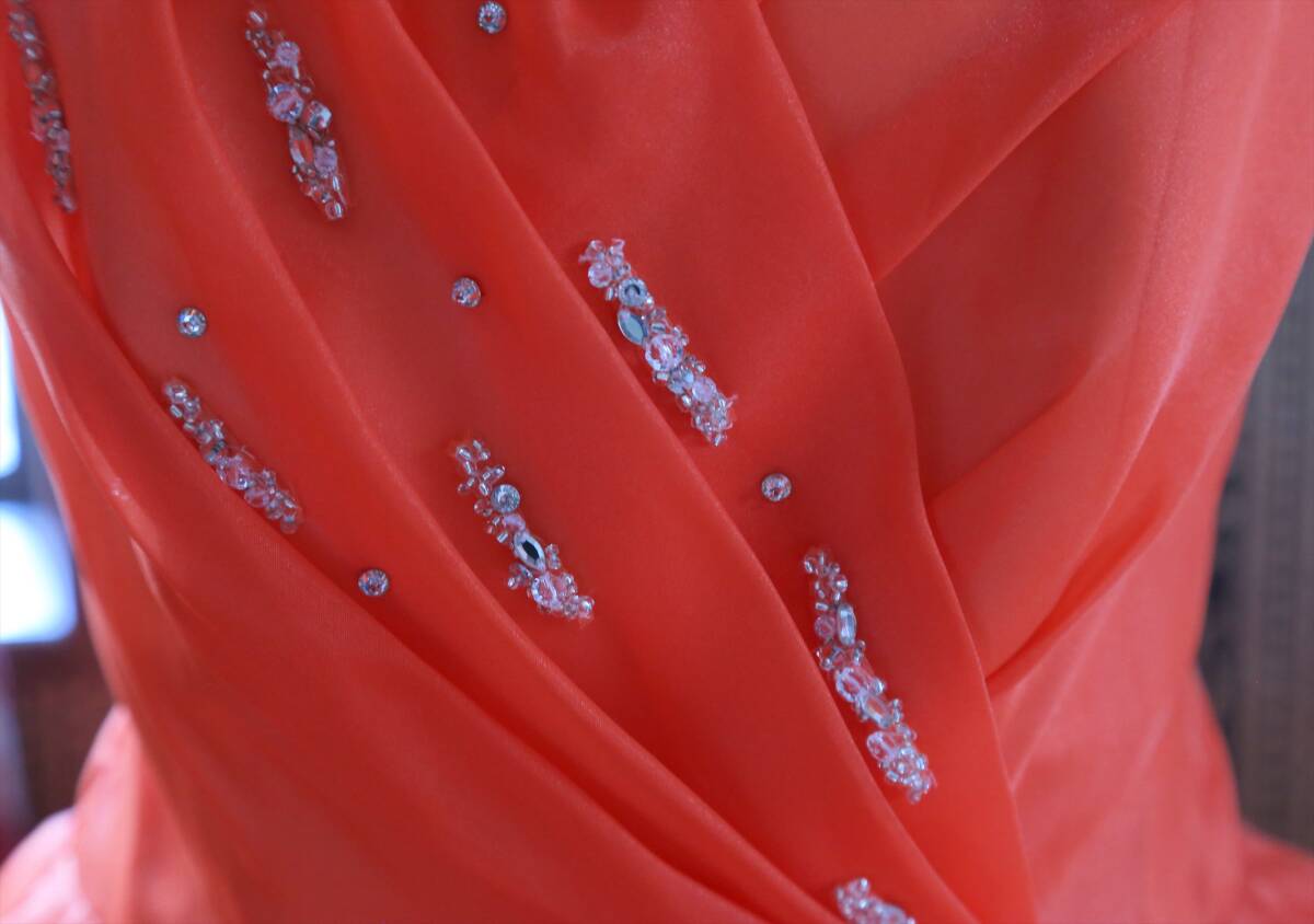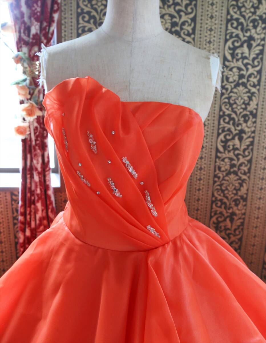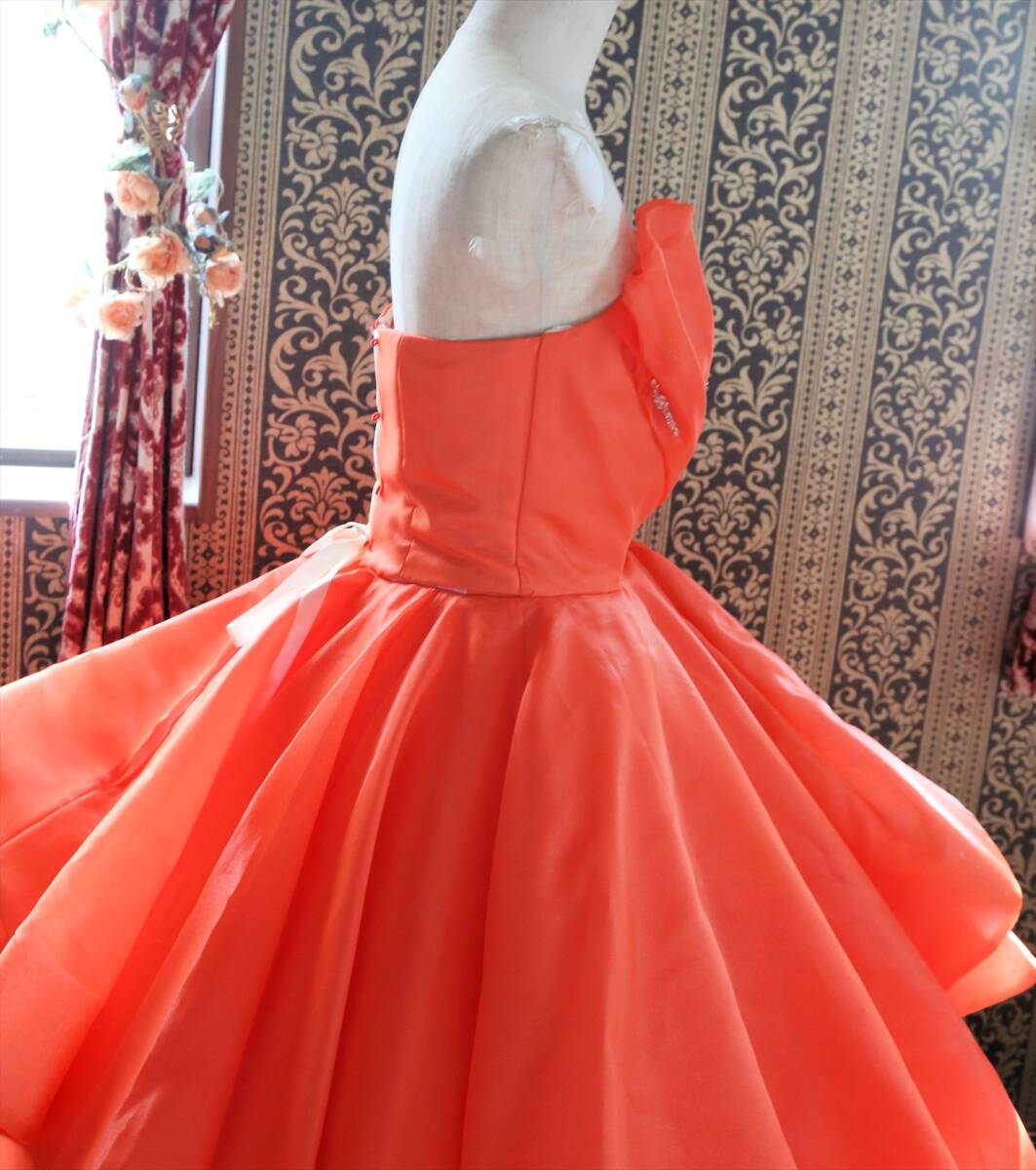 メインの生地はオレンジのオーガンジーで、一部サーモンピンクのオーガンジーとキナリのチュールとサーモンピンクのチュールを重ねた生地になっており、チュールにはスパンコールがあしらわれています