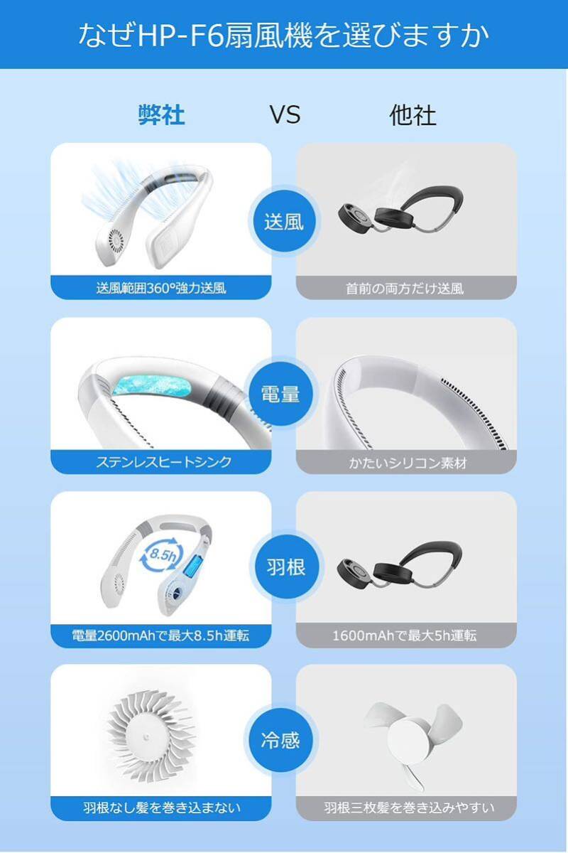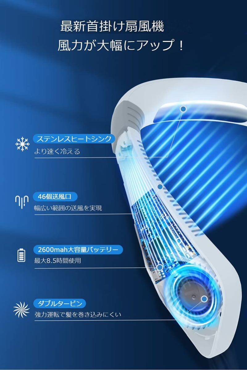 【携帯扇風機 長時間使用&軽量タイプ扇風機】2600mAh大容量バッテリーで、最大稼働時間が8.5時間と長く、外仕事が多い方やアウトドアに最適。(風量や使用環境によって変動します。)真夏のマスク使用もこれを使えば快適に過ごせます。225gと軽量なので、首や肩への負担も軽く、使いやすい首かけ扇風機です。