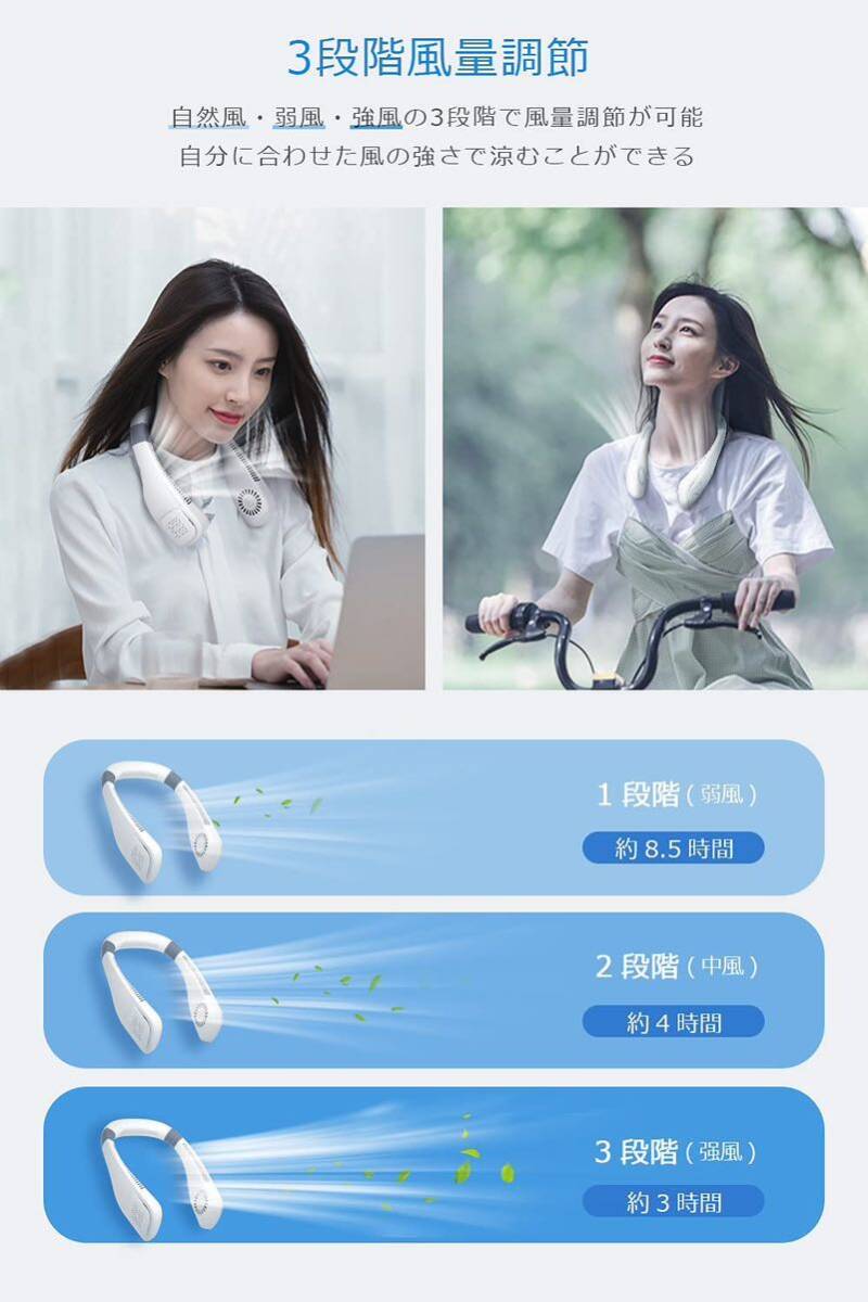 【首掛け扇風機 羽根なし&三階段風量調節】この首掛けタイプの携帯扇風機は、羽根がないので髪の毛の巻き込みや、けがの心配もありません。ONとOFFの切り替えはスイッチを長押しするだけ。スイッチを押すごとに風量を3段階から選択可能、炎天下の屋外では「強」、室内では「中」、冷房の効いた涼しい部屋では「弱」など、使用するシーンごとに風量を切り替えられるので便利です。
