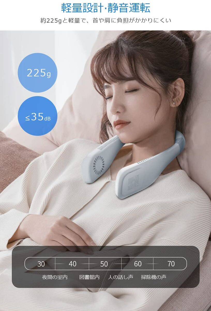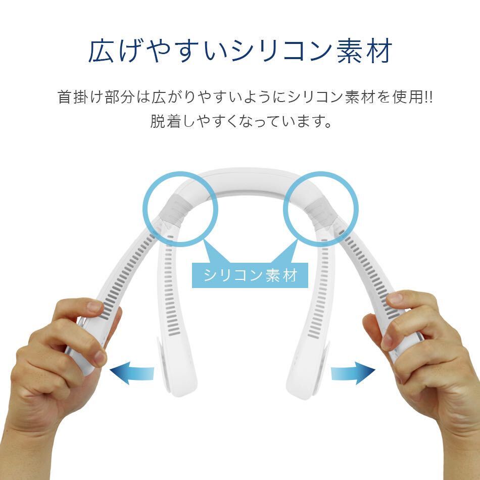 【くびかけ扇風機 静音】耳元に近いぶん、手持ち扇風機などよりもファンの音が気になってしまいがちですが、高性能DCモーターを採用しており、強力な風量を確保しながらも回転音が気にならないミュート設計です。会議や病院などの音が気になる場所でも気をつかわず使用することができます。
