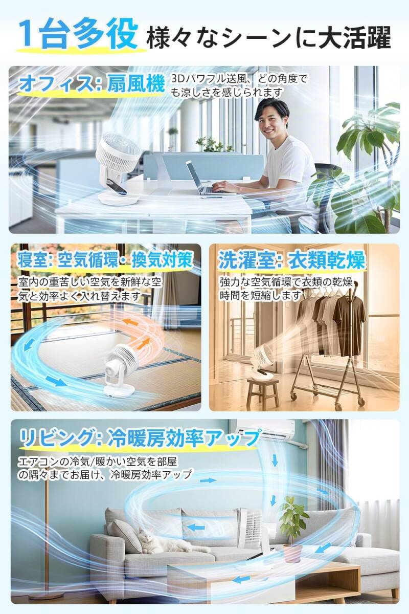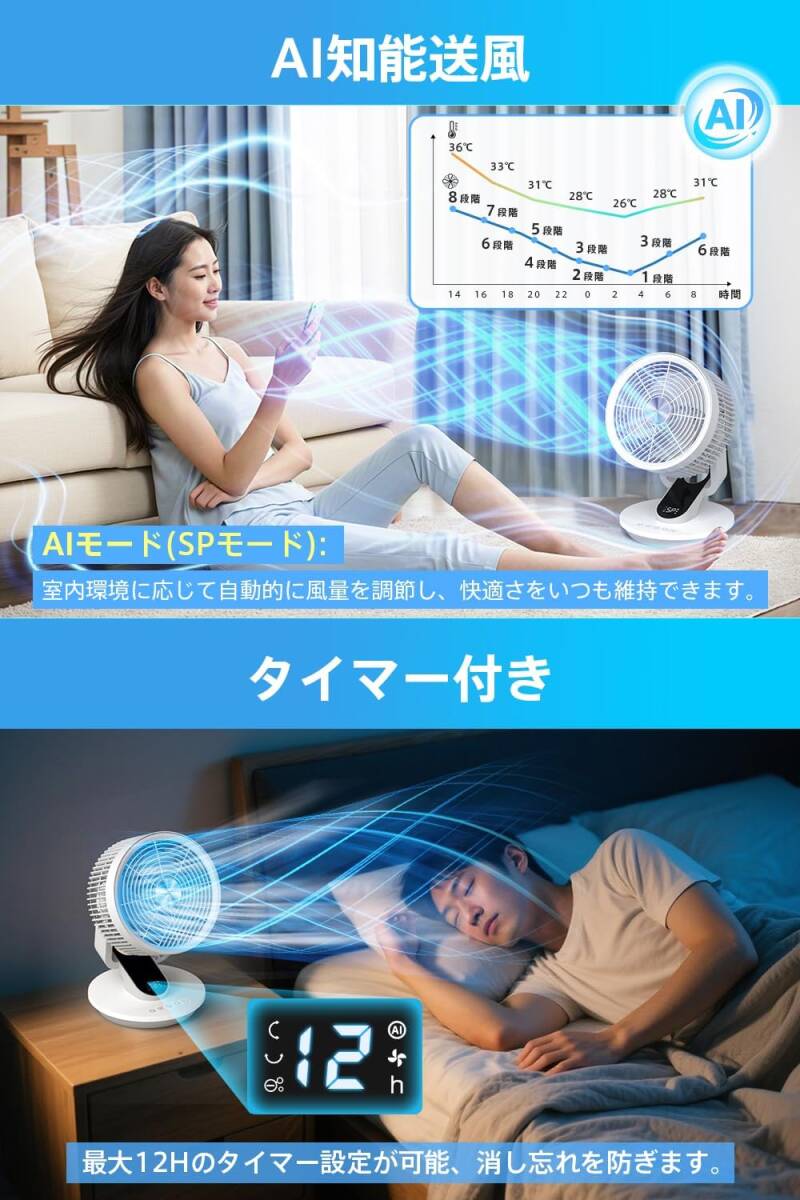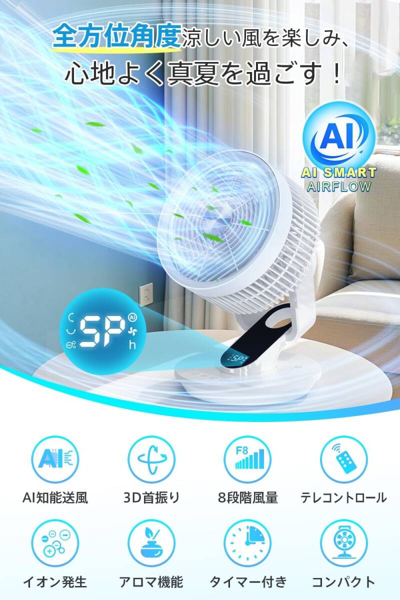 【AI搭載 &360° 3D首振り】 サーキュレーター 扇風機兼用 DCモーター 節電対策 リビング/卓上扇風機 大風量 パワフル送風 8段階