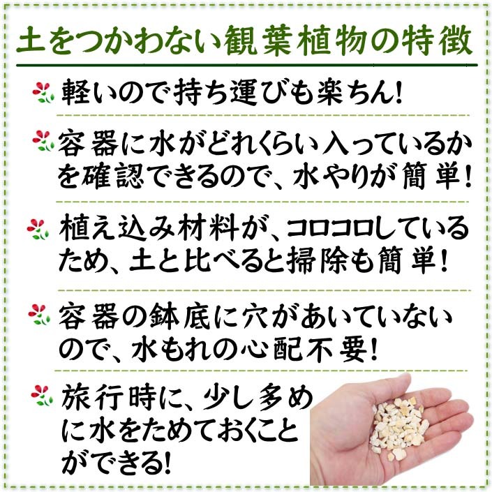 ![]() ハイドロカルチャーは、土壌中からの虫の発生が少なく、また臭い等もなく、非常に清潔です。 土と違ってコロコロしているため、 こぼしても掃除も楽で室内を汚すことも少ないですよ♪