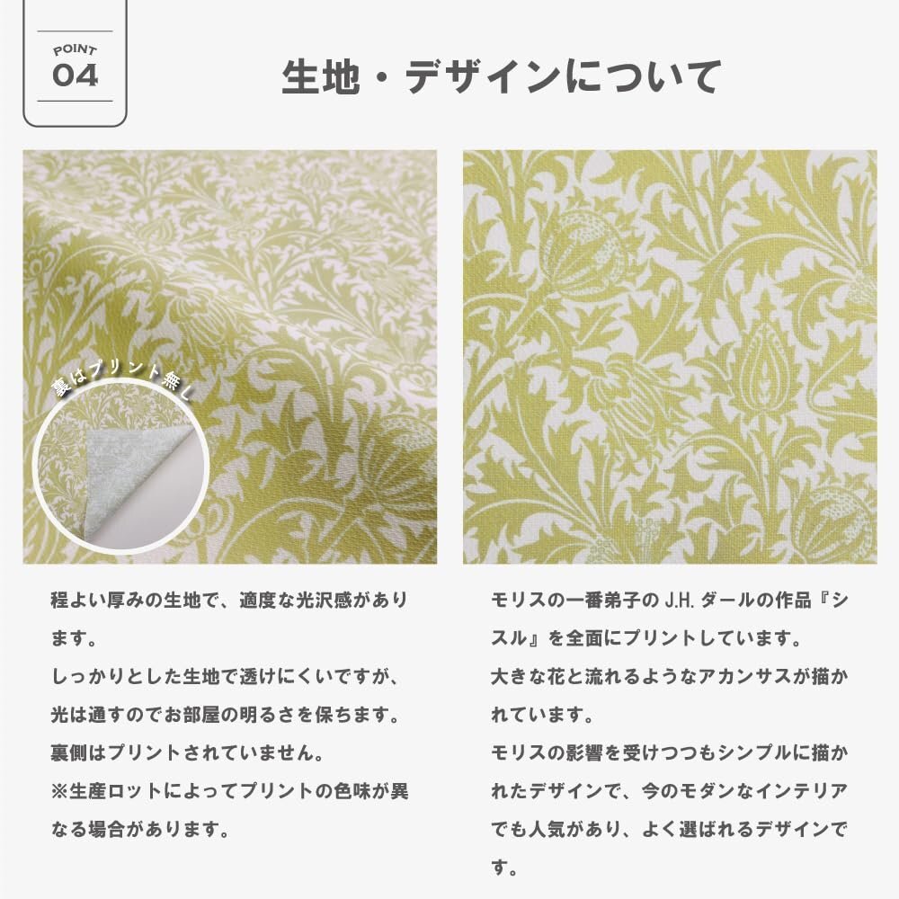 ・モリスの没後、J.H.ダールが1897年にデザインしました。・モリスのデザインより様式化されていますが、線からはモリスの影響が強く感じられます。・ネオ・ゴシック様式の影響を受けているこのデザインは、大きな花と流れるようなアカンサスが描かれていて、機械プリントに最初に選ばれた図案のひとつでした。・今のモダンなインテリアでも人気があり、よく選ばれるデザインです。※障子レース生地を貼る際、生地の表と裏を間違わない様にしてください。・(※光沢がある面が屋外側になります。)梱包状態のたたみシワが気になる場合はアイロンを掛けてから貼ってください。