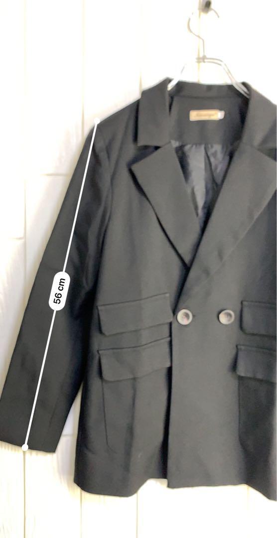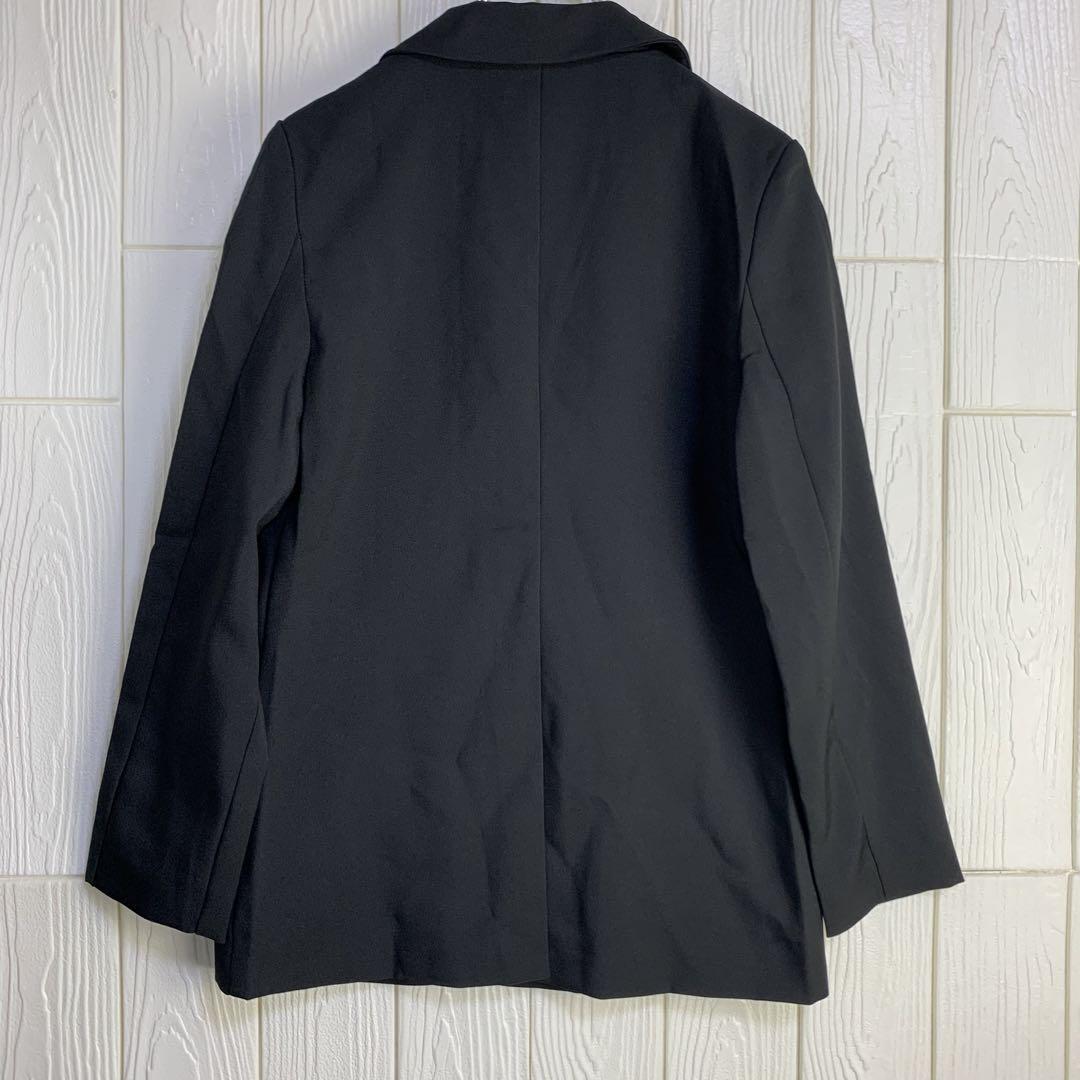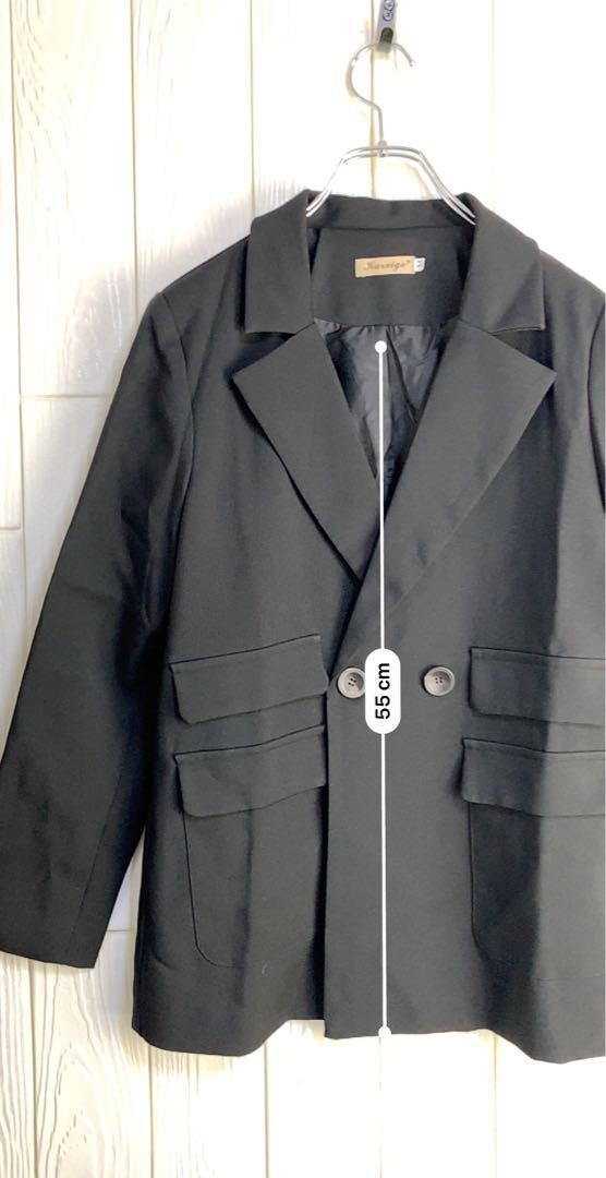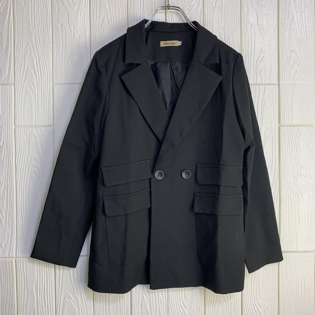 シンプルなブラックのスーツ・ブレザーセット、ダブルボタンとウエストゴムのパンツ付き。