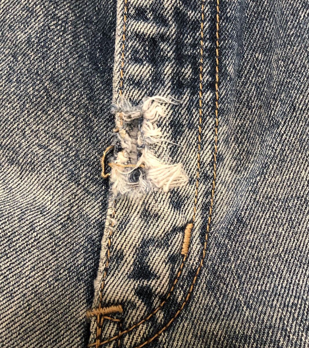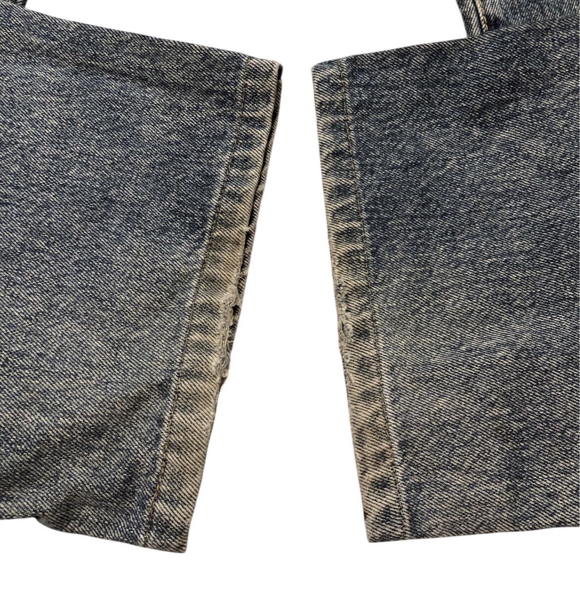 大きいダメージは見当たりませんが、少し色落ち、薄い汚れがあります。ポケット口、裾に少しダメージがあります。ジップ前部分にダメージがあります。太ももに汚れがあります。