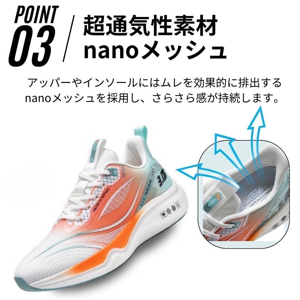 アッパーは通気性たっぷりのメッシュ素材で長時間履き続けても蒸れが気にならない。