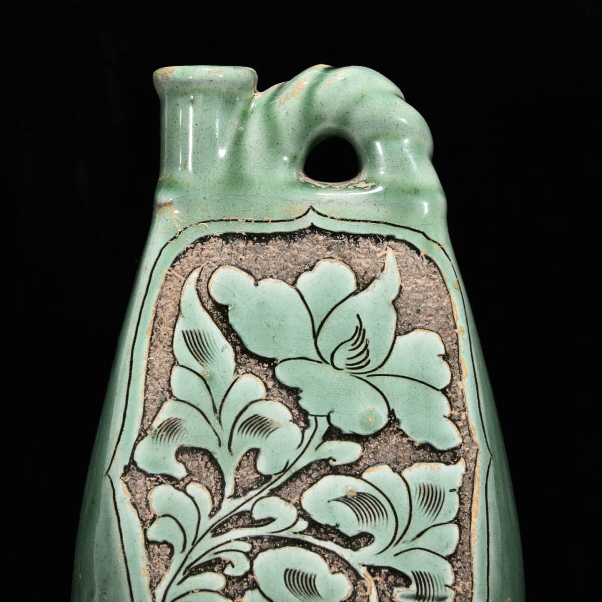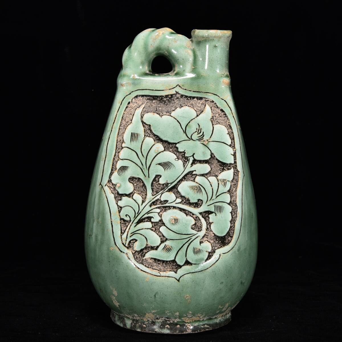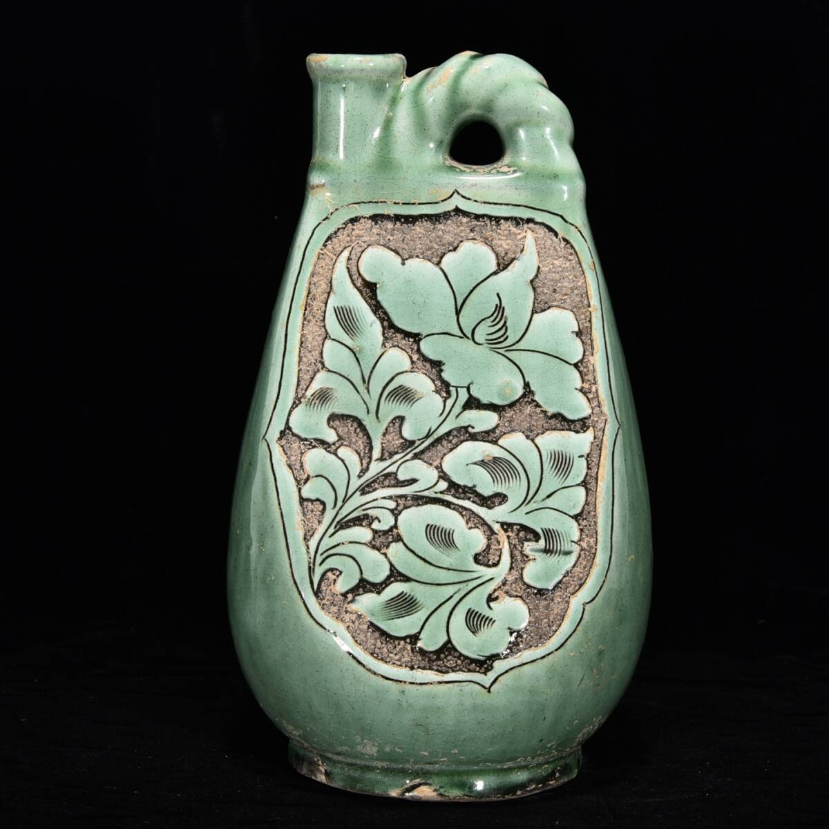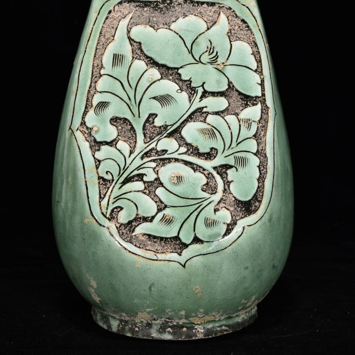 中国骨董 磁器【磁州窯緑釉刻花紋壺です】工芸品 施釉陶 青花磁 陶芸 本物 古美術 旧蔵 珍品
