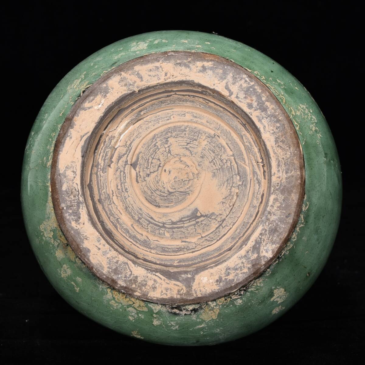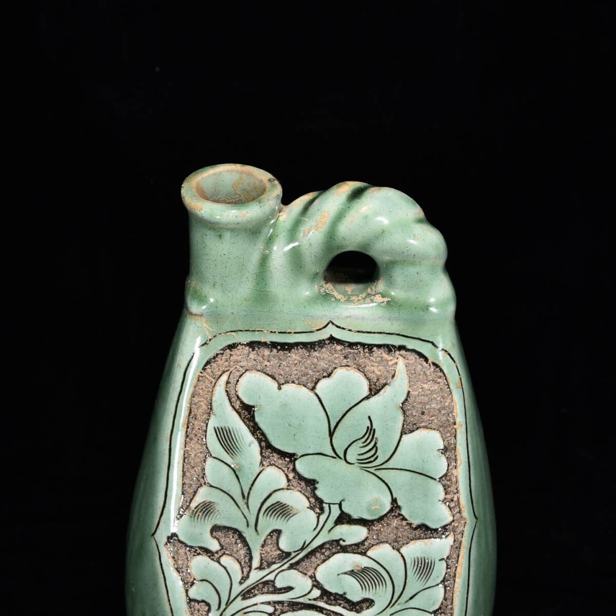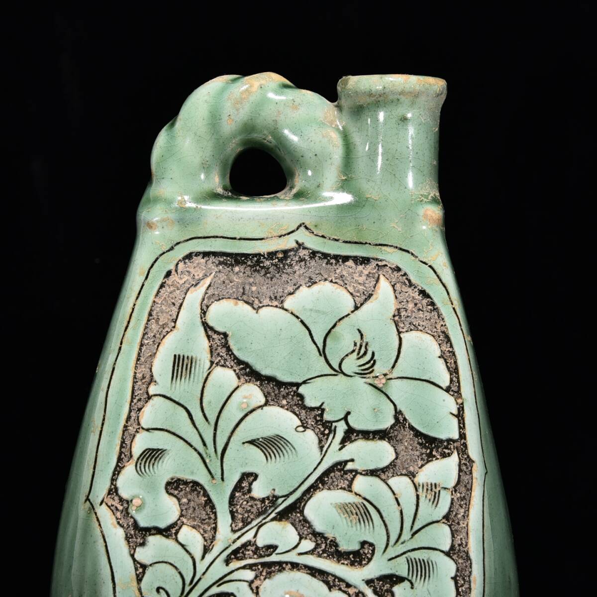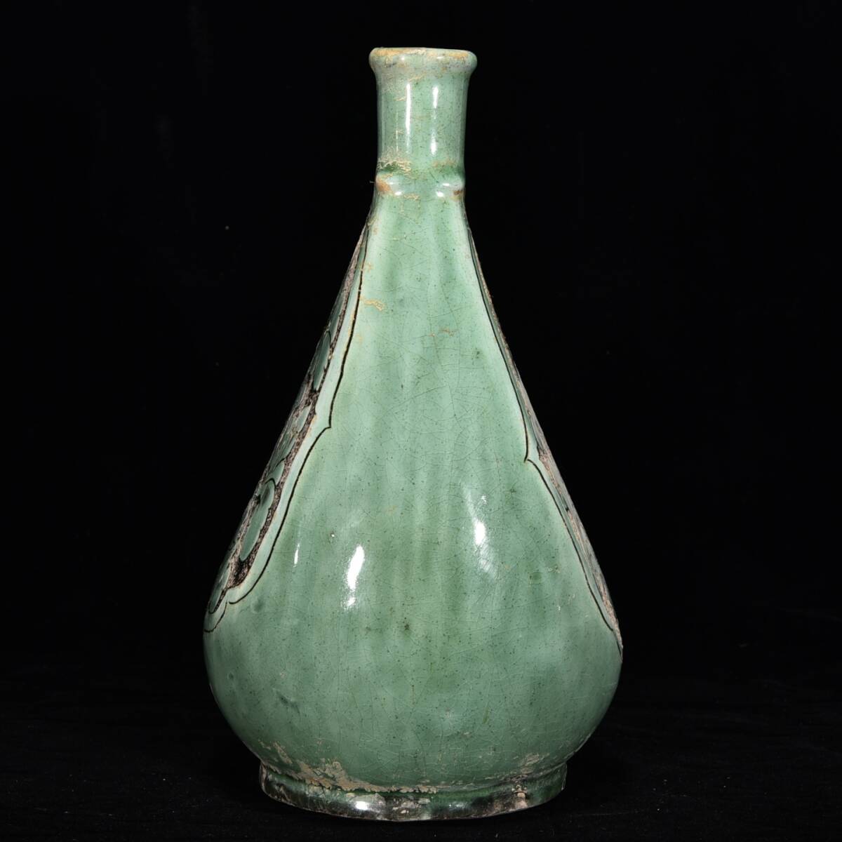 中国骨董 磁器【磁州窯緑釉刻花紋壺です】工芸品 施釉陶 青花磁 陶芸 本物 古美術 旧蔵 珍品