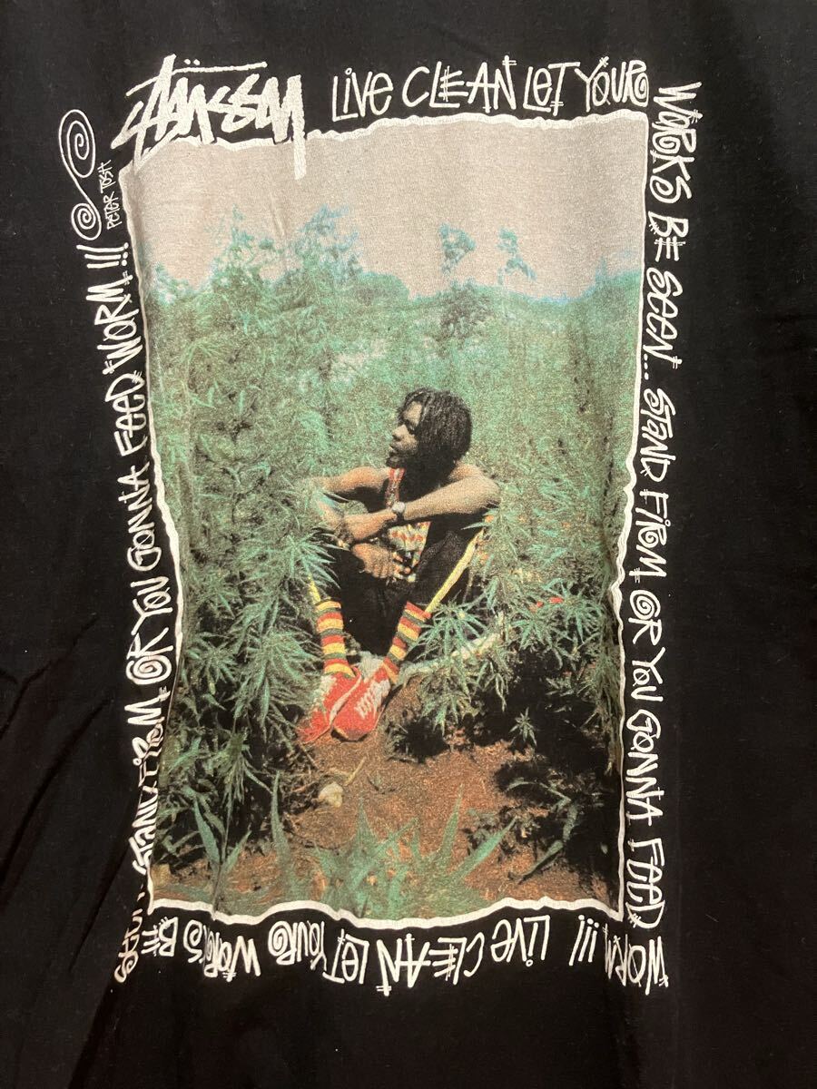 レゲエミュージシャンのピータートッシュがマリファナ畑で、リラックスして座っているTシャツです。
