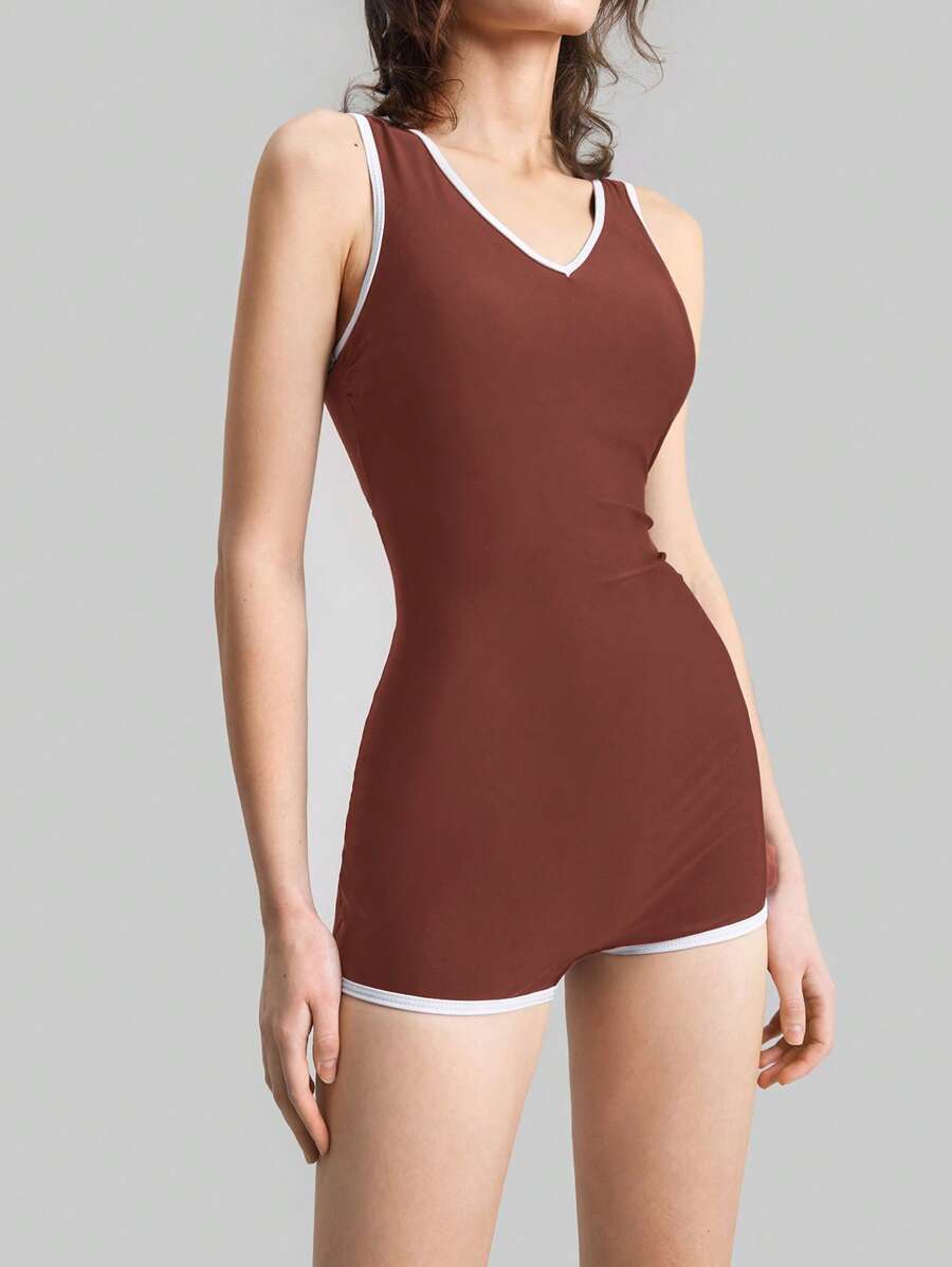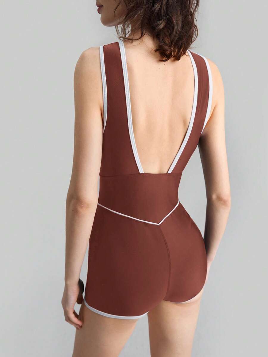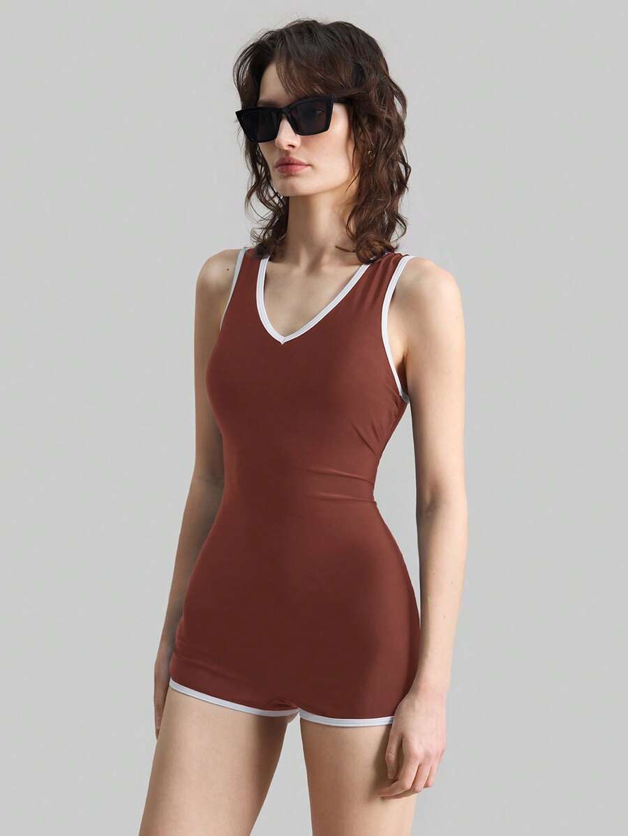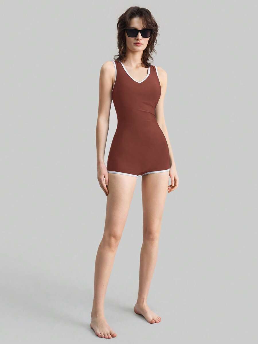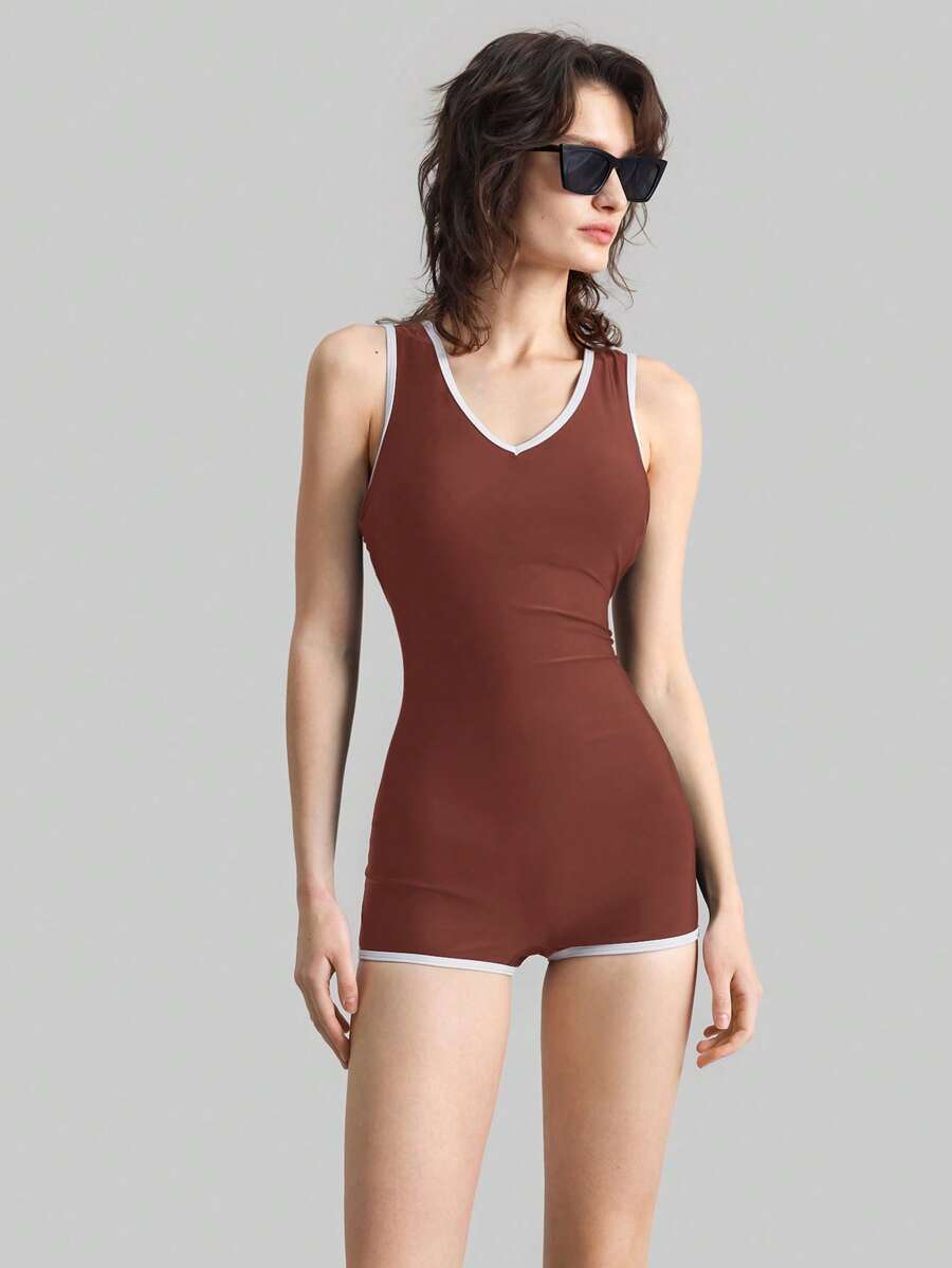 レディース 水着 ワンピース 2025年 レディース カラーブロック ノースリーブ ミニマリスト フィットジャンプスーツ、レディー