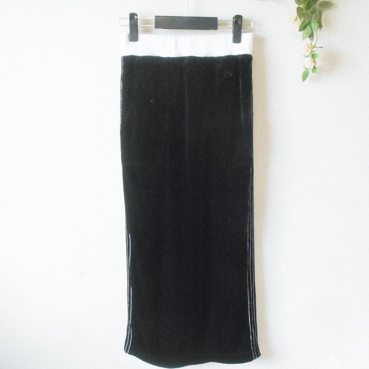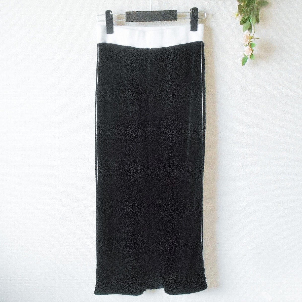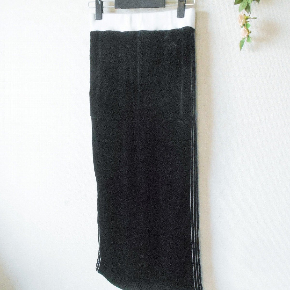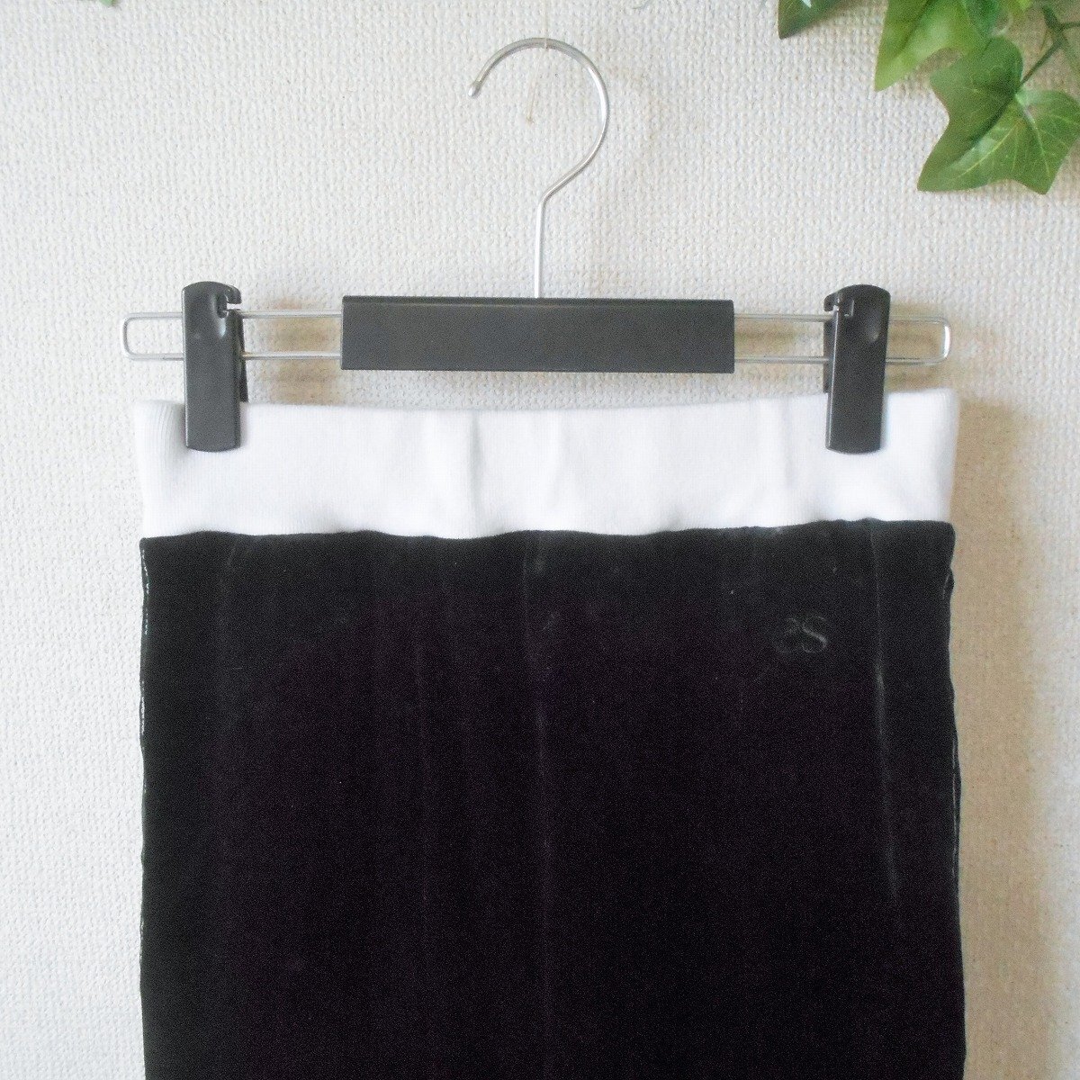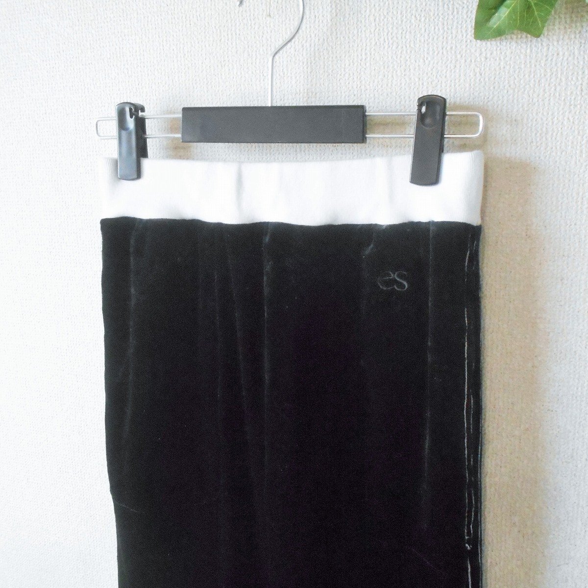 【ポイント】ダブルスタンダードクロージング、エッセンシャルのスカートになります。お色は黒色ベースで秋冬を中心に着ていただけるお品です。ベロア生地のロング丈で、とっても素敵なデザインです。