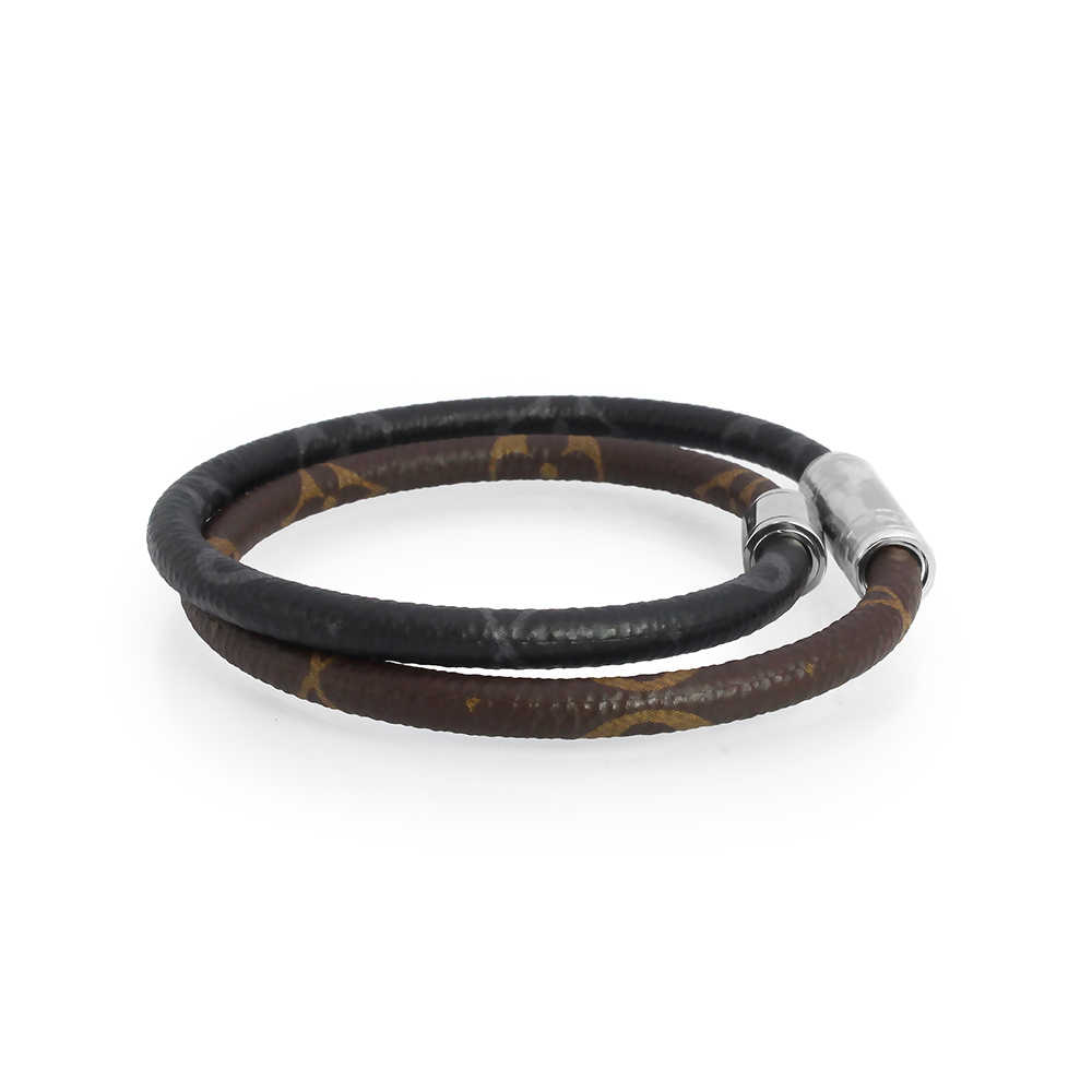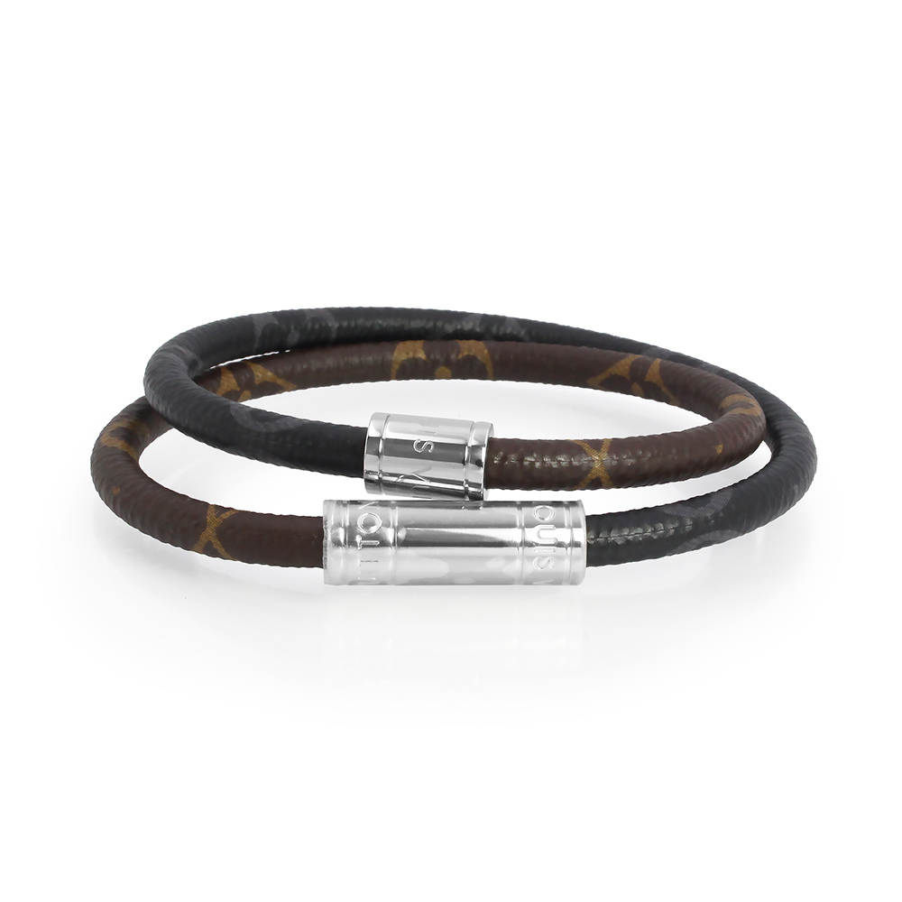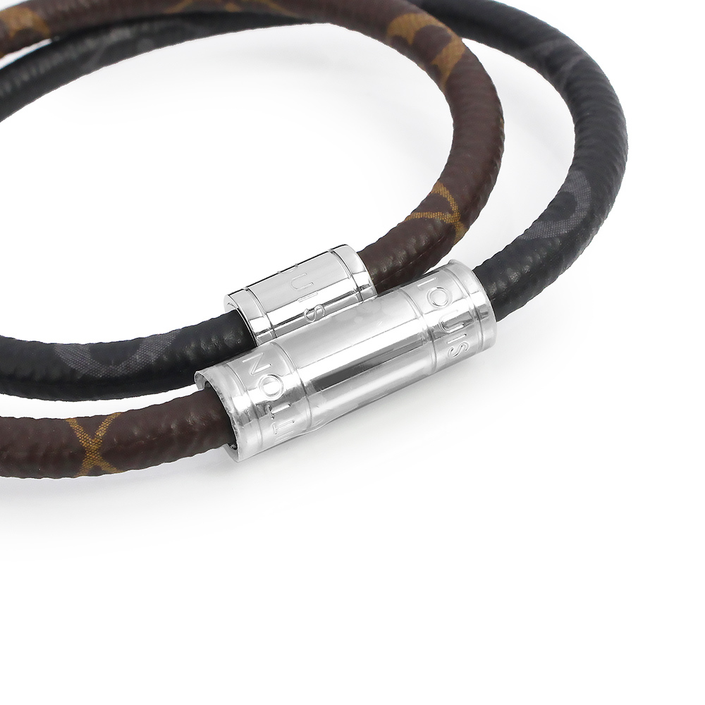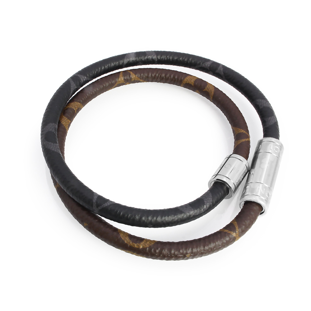 アイコニックなモノグラム・エクリプス キャンバスとモノグラム・マカサー キャンバスの組み合わせが、レイヤード効果を演出する「ブレスレット・キープ イット」。「Keep it」の名に相応しく、シルバーカラーのユニークなクラスプが採用され、2重巻きのスタイルがインパクトのあるデザインです。「Louis Vuitton」シグネチャーの刻印がスタイリッシュな雰囲気を放ちます。