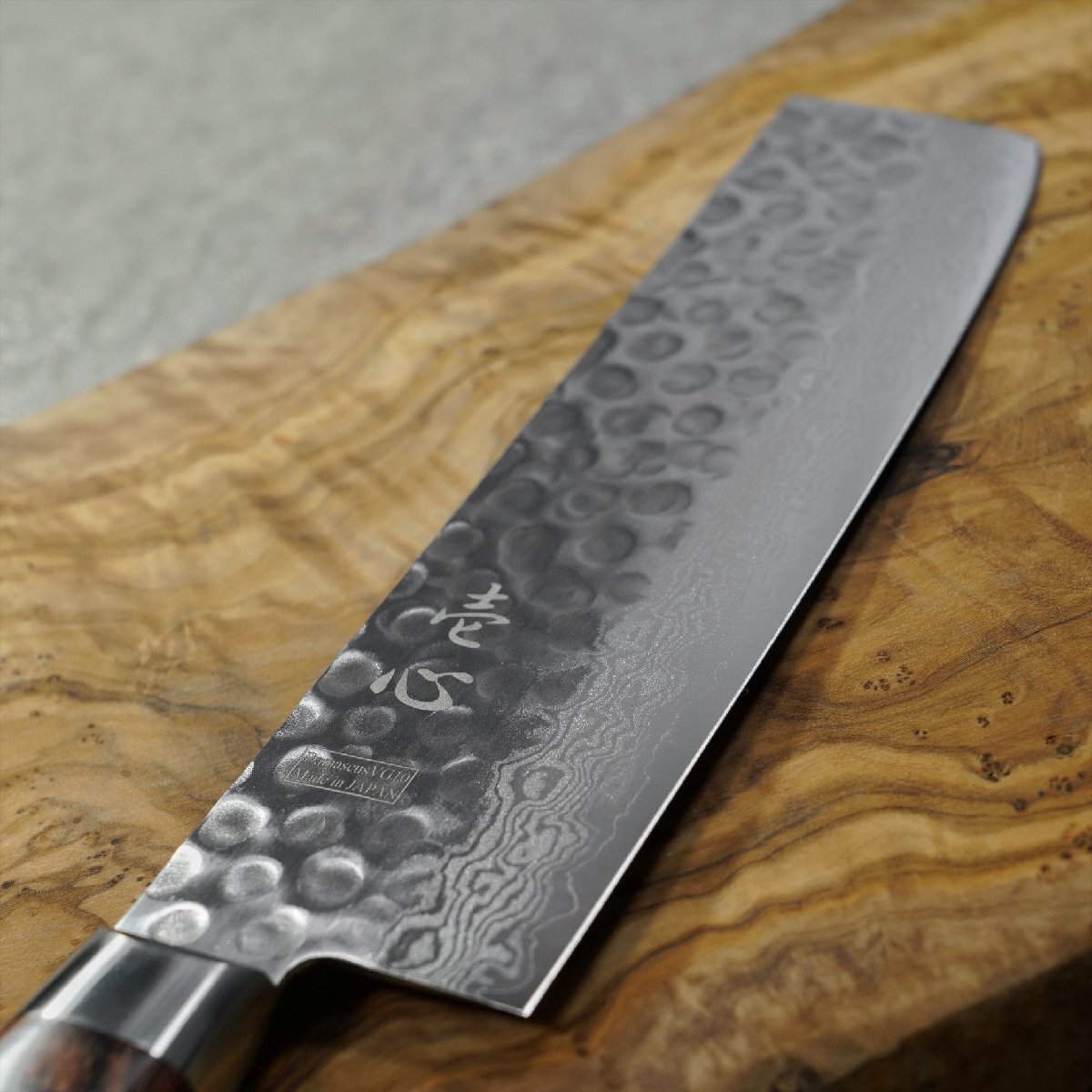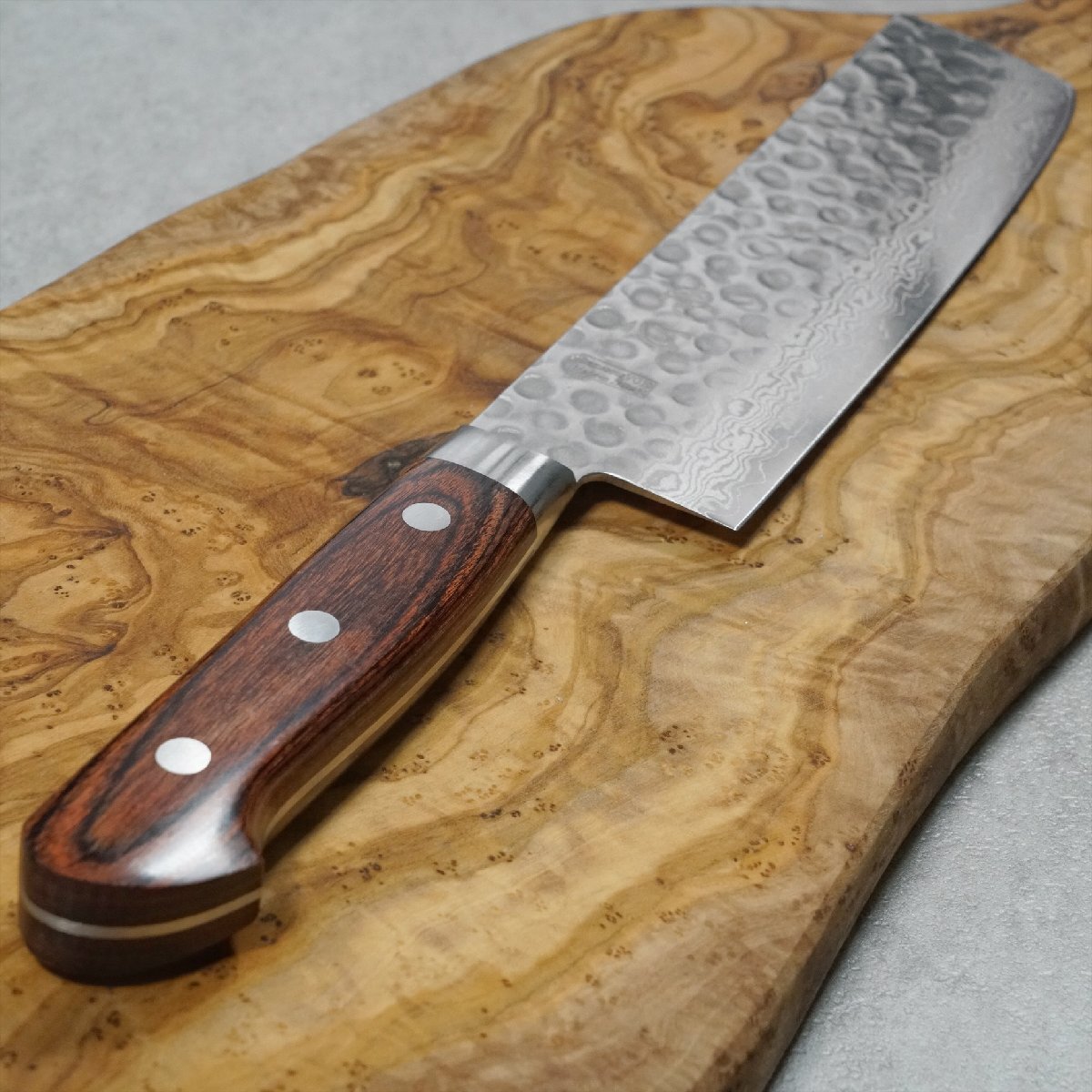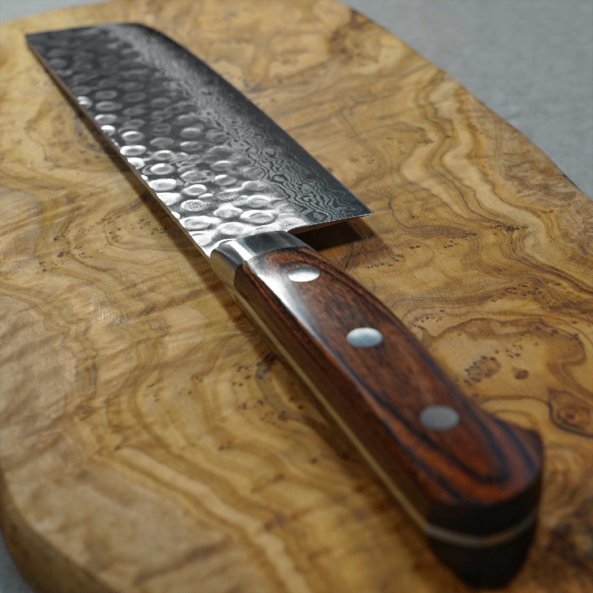 デコボコした槌目模様が食材ぴったりと張り付いて取れないということを防ぎます。また、安い包丁はどれほど鋭く研いでも切る力がとても必要なものがあります。それは、刀身が真っすぐだったり、厚みがあるとそうなります。しかし、この包丁の刀身はハマグリ刃と呼ばれる断面形状で、ハマグリのカーブに似ている形状です。ハマグリ刃は食材に食い込みやすく、かつ刀身の強度も強める理想的な構造です。またそれは切った食材が刀身に貼り付きにくい効果も産み出します。