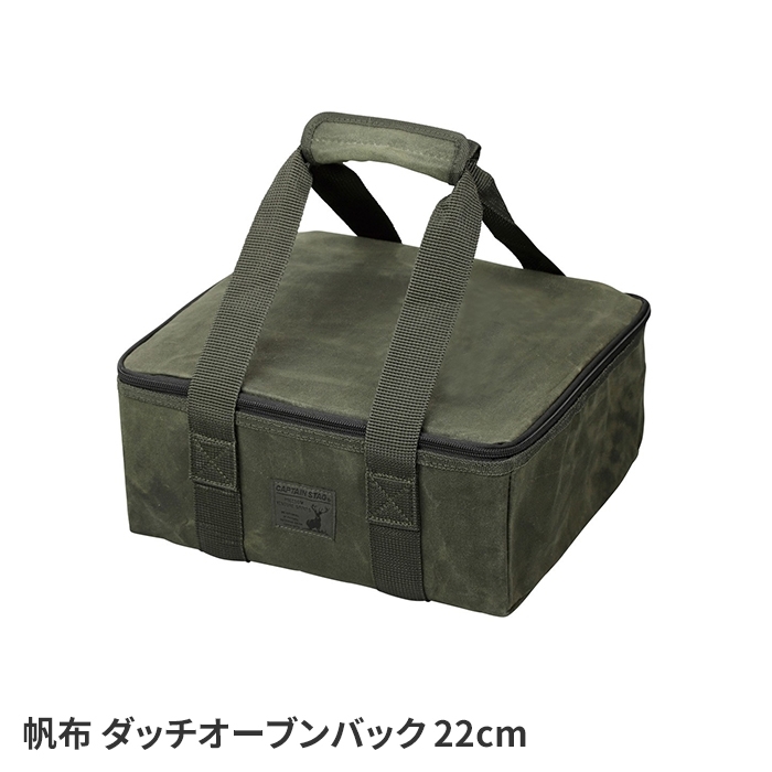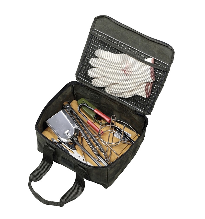 丈夫で風合いの良い帆布生地を使用。 角型なのでダッチオーブンだけでなくスキレットやキャンプ小物も収納できます。 便利なメッシュポケット付き。 |