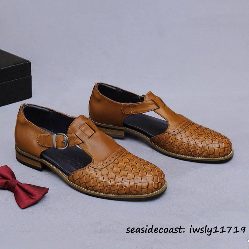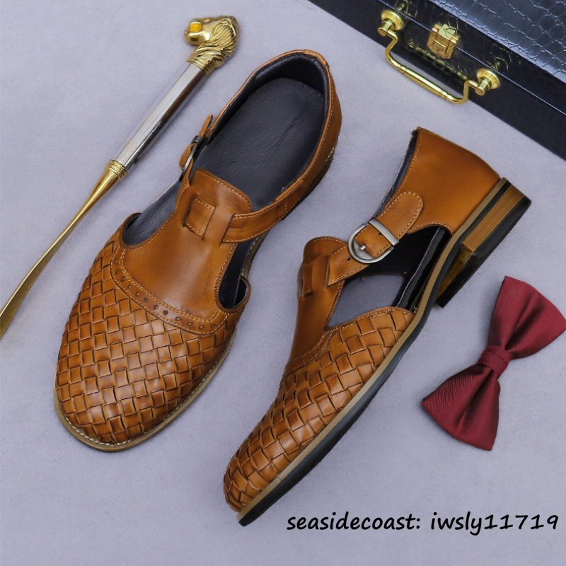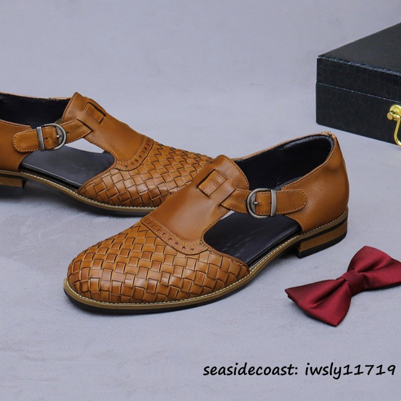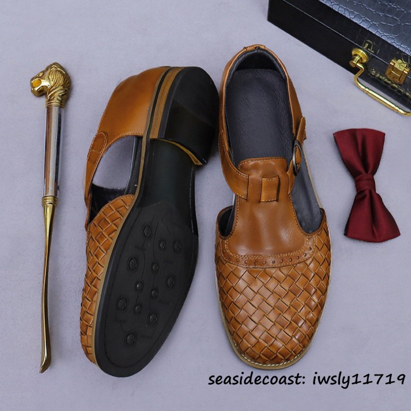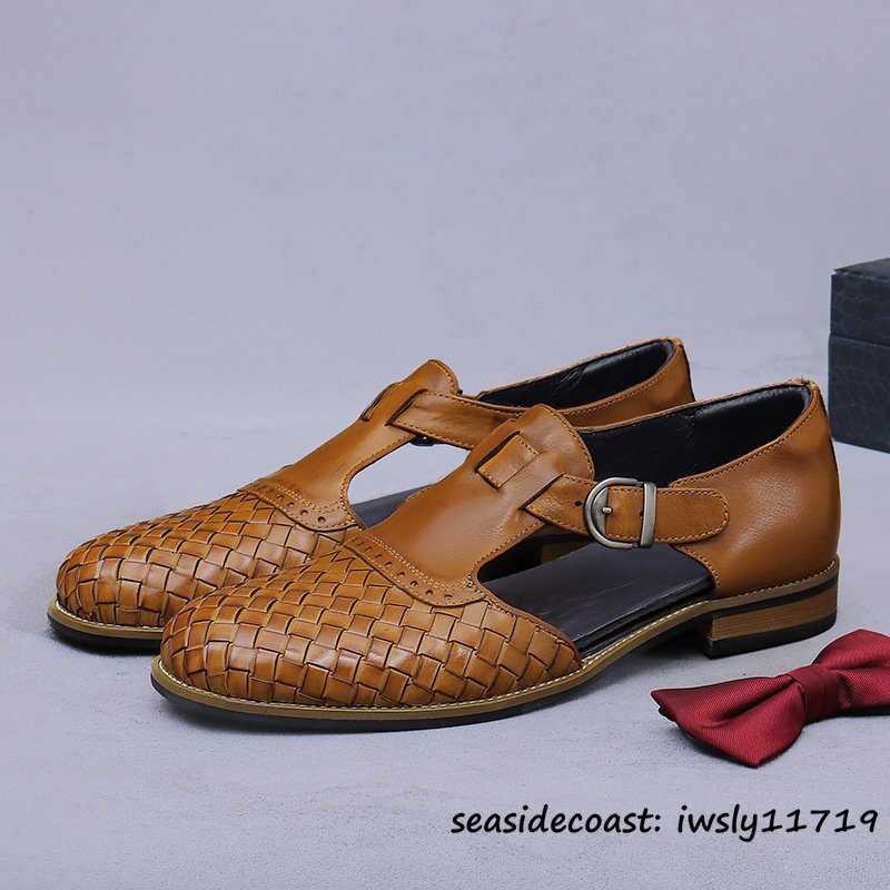 定価9万超★サンダル メンズ 本革 職人手作り 編み込み 彫り ビジネスシューズ 高級牛革 紳士靴 革靴 メッシュ イギリス風 ブラウン 27.0cm