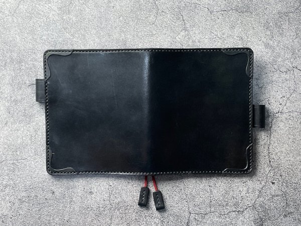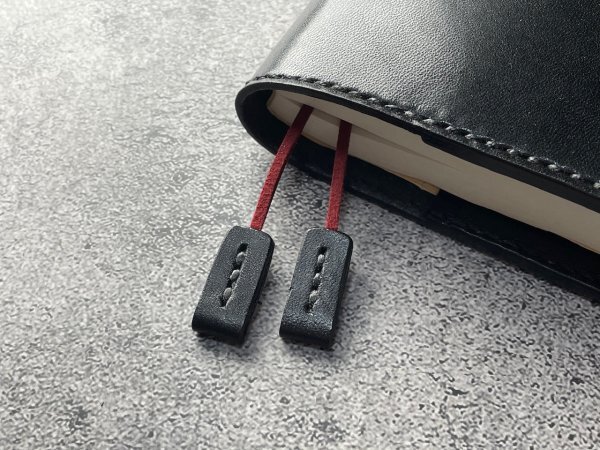 □2箇所に入れられるのスエード紐のしおりも付けました。