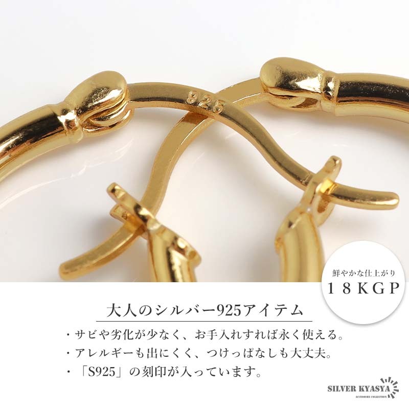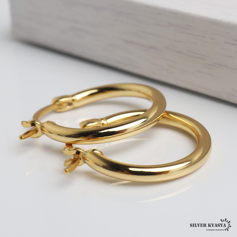 ゴールドカラーが目を惹くシンプルなフープピアス。18KGP仕上げの鮮やかさが魅力的なアイテムです。中空仕様なのでとっても軽くつけっぱなしも大丈夫!