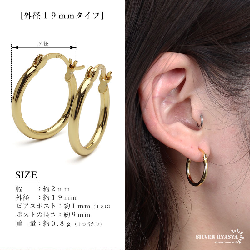 外径19mmタイプ:幅約2mm、外径約19mm、ピアスポスト約1mm(18G)、ポストの長さ約9mm、重量約0.8g(1つ当たり)