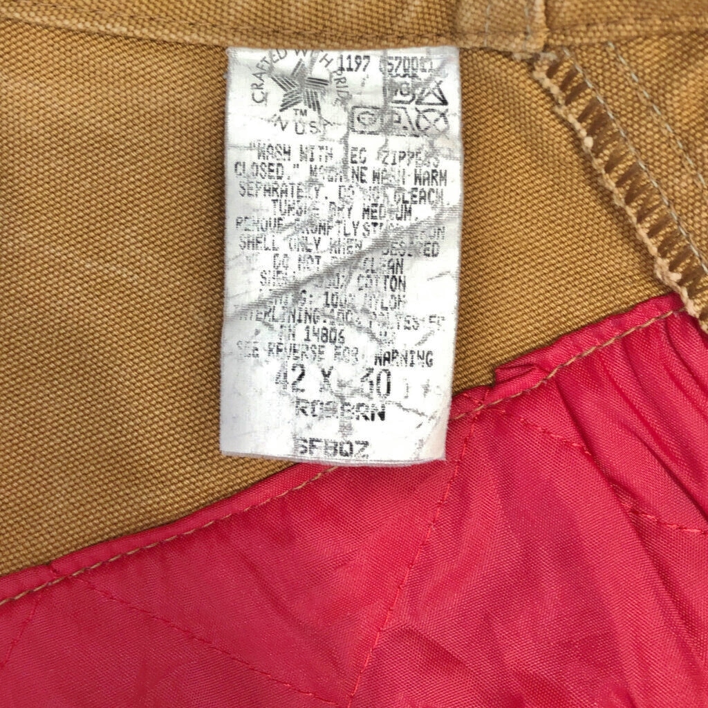【商品管理番号】 R7781 【ブランド】 Carhartt/カーハート 【サイズ】 W42 L30 【実寸サイズ】 総丈:約156cm ウエスト:約120cm 股下:約71cm わたり幅:約33cm 裾幅:約26cm 【主な素材】 表地 : コットン 裏地 : 13848 中綿 : 13897 【色】 ライトブラウン 【仕様】 生産国 : USA製 80年代 大きいサイズ、ワーク ダック ダブルニー ビブオーバーオール 【状態】 汚れ:全体 キズ:裾 |