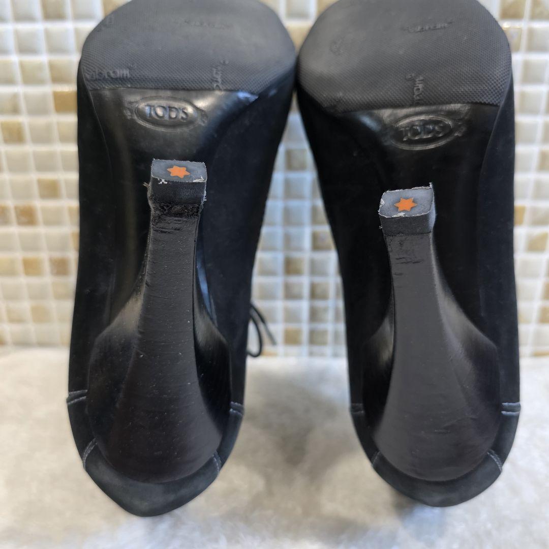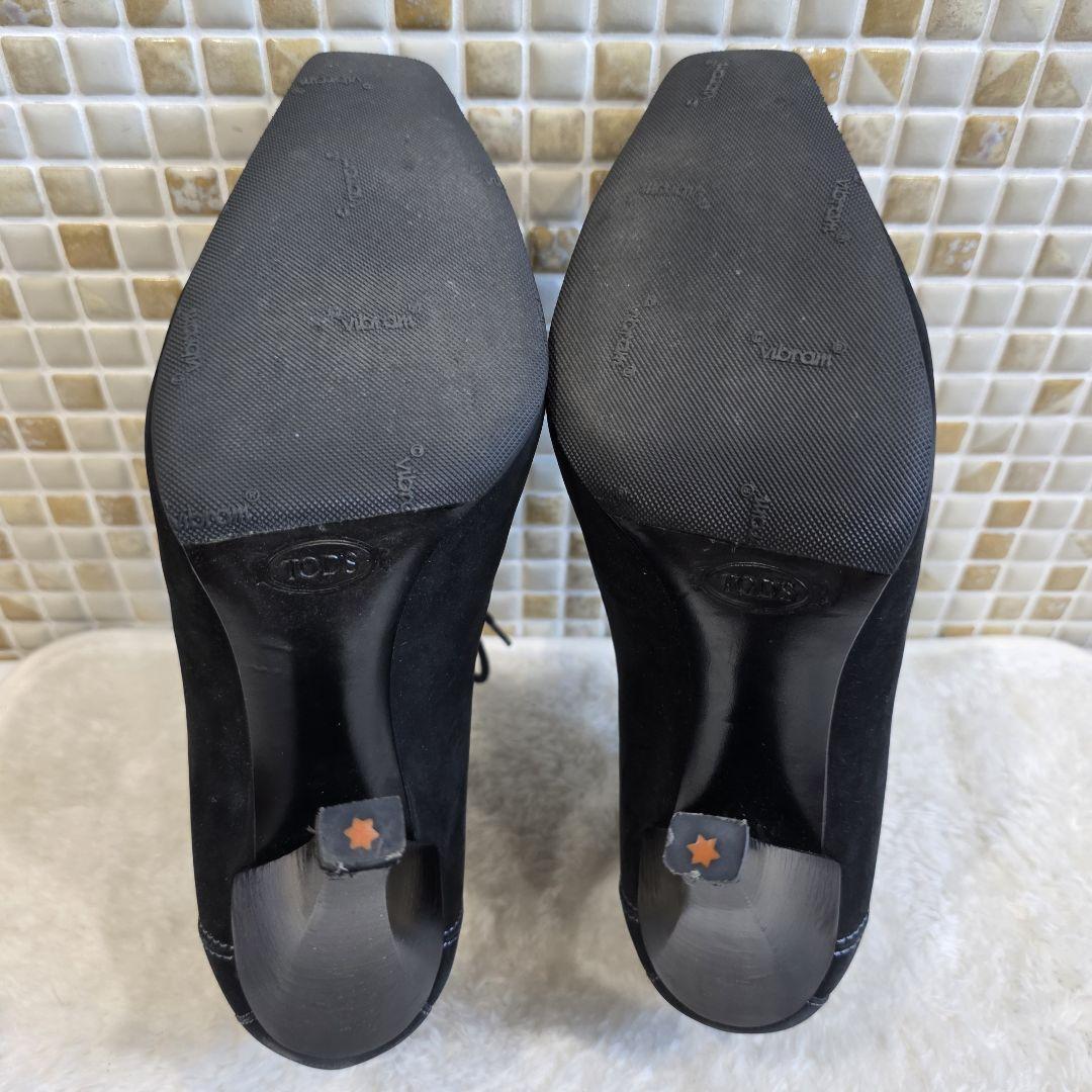 高級感漂うスエード素材を使用したTOD'Sのレースアップブーティ。深みのあるブラックに映えるホワイトステッチがアクセントとなり、スタイリッシュで上品な印象を与えます。洗練されたスクエアトゥと美しいヒールラインが、足元をすっきりと見せてくれる一足です。