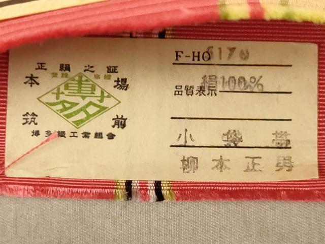 【正絹】 詳細に関しましては、画像をご確認ください。 本場筑前博多織は、 福岡県福岡市博多区やその周辺で生産される絹織物です。 仏具のひとつである独鈷、華皿を基にした幾何学模様が織られています。 江戸時代に筑前藩主だった黒田長政が幕府への献上品にしたことから、 博多献上、献上博多とも呼ばれます。 横畝が際立って見える経畝織りという織りになっています。 30〜60本の細い経糸を使うため、こしやはりがあり、 地合が硬く、光沢感があります。 きちんと締まり、くずれにくい、締めやすい帯といわれています。 大変上質な逸品になります。 お安く出品致しますので、是非この機会にいかがでしょうか? |