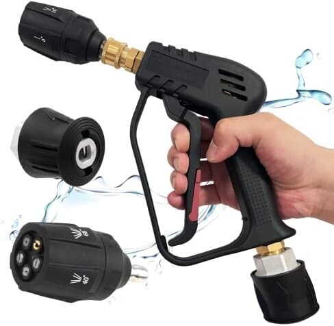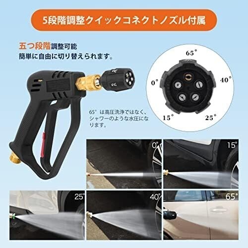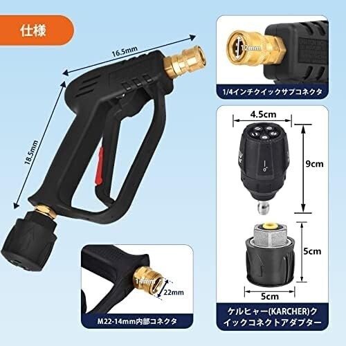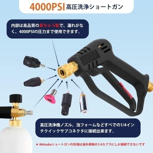 Akitsuba 高圧洗浄ショートガン ケルヒャーショートガン ショートガン 高圧洗浄ガン ケルヒャー対応 ケルヒャーノズル 4000PSI 高圧洗浄機 ケルヒャーフォームガン 洗車 ケルヒャー(Karcher)Kシリーズ K2 K3 K4 K5 K6 K7 JTKに対応 真鍮製 M22-14mmクイックコネクトアダプター 5in1ノズル(8L/min)付き (0~65度)調整可能 商品詳細 【狭い所も使えやすい高圧洗浄ショートガン】Akitsuba高圧洗浄ショートガンは、ケルヒャー(Karcher)Kシリーズに適用、元の長いガンより短く、片手で操作しやすいショートデザインを採用しています。