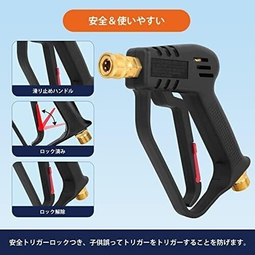 また、高圧洗浄機のショートガンには安全トリガーロックが付いており、偶発的なトリガーのトリガーを防ぎ、事故や怪我を防ぎます。