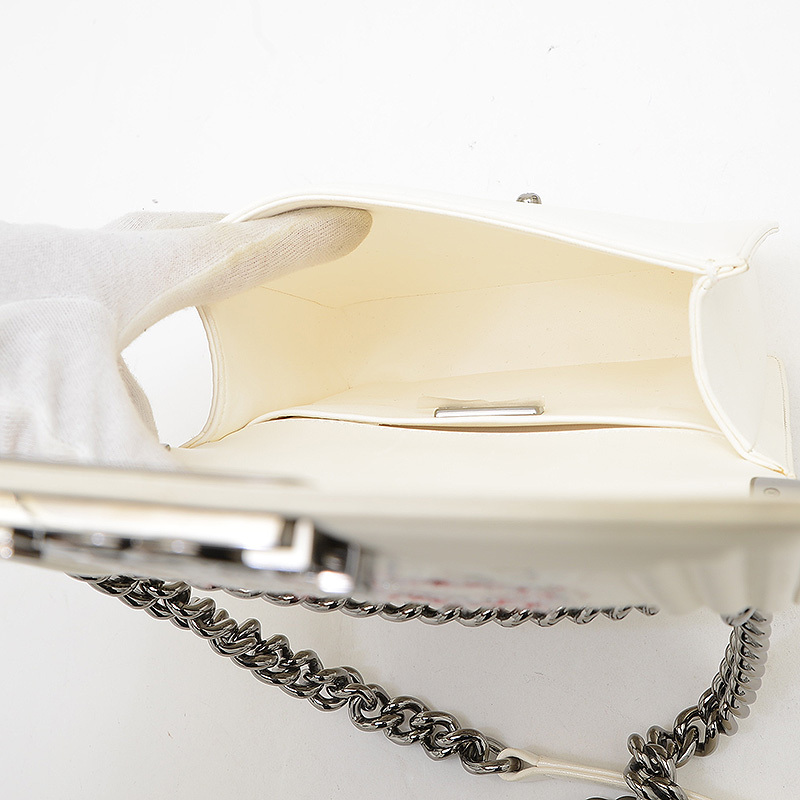 | 商品特徴 | その特徴的な長方形のフォルムに、軽やかなキャンバスと上質なレザーの組み合わせが融合したショルダーバッグです。クリーンなホワイトカラーと、アンティーク調のチェーン、大胆なCCロゴのクラスプがアクセントとなり、クールでありながらも洗練された雰囲気を演出します。コンパクトながらも収納力を備え、日常使いから特別な日まで、装いに洗練されたエッジを添える人気のアイテムです。 |