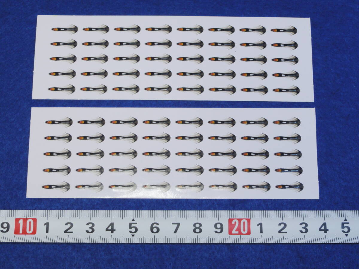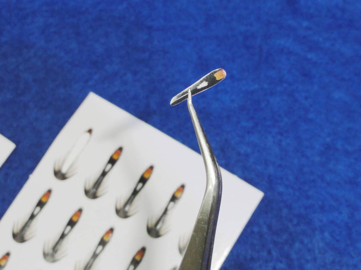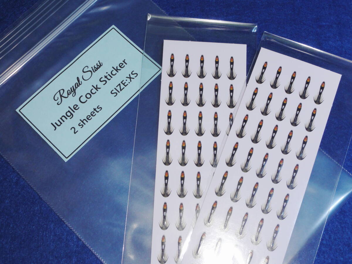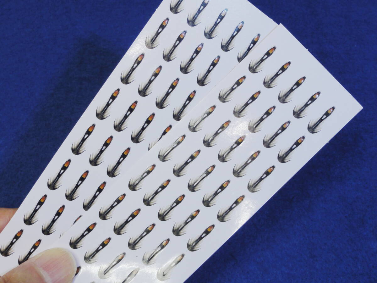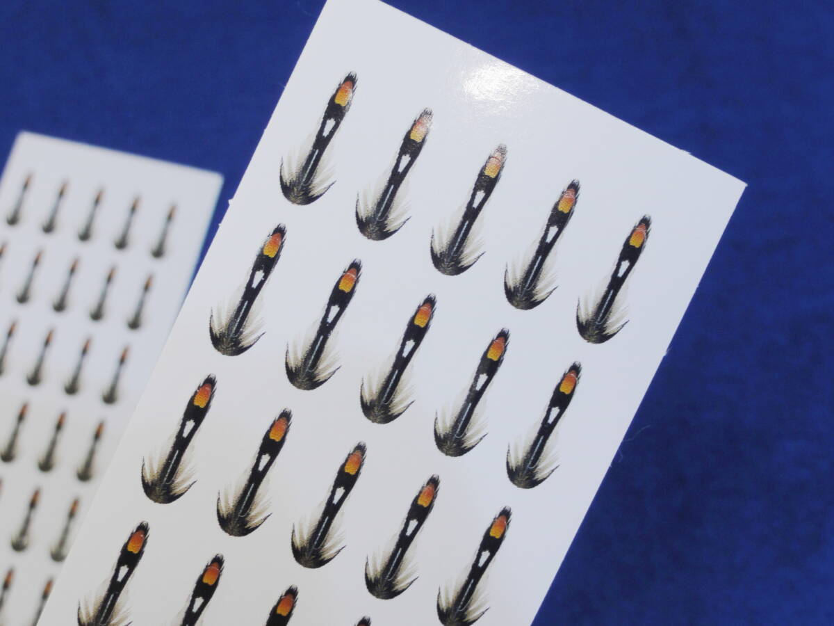 ご覧頂きありがとうございます。 ジャングルコックを模したシンセティックマテリアルになります。 柔軟性のあるポリ素材でできており、プレカットしてあります。 UVレジンを塗布するとよりリアルになります。 1シートに40枚、2シート合計80枚入っています。 ※最後の画像は見本です。フライは商品には含まれません。 ステッカーのサイズ(長さ×幅) 約10ミリ×1.5ミリ フックサイズ目安:#14~#12 シートのサイズ:14×5.5センチ(2シート入っています) ※同日落札の商品のみ同梱発送可能です。 | ||