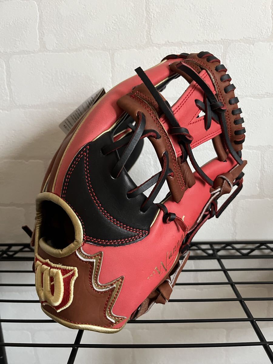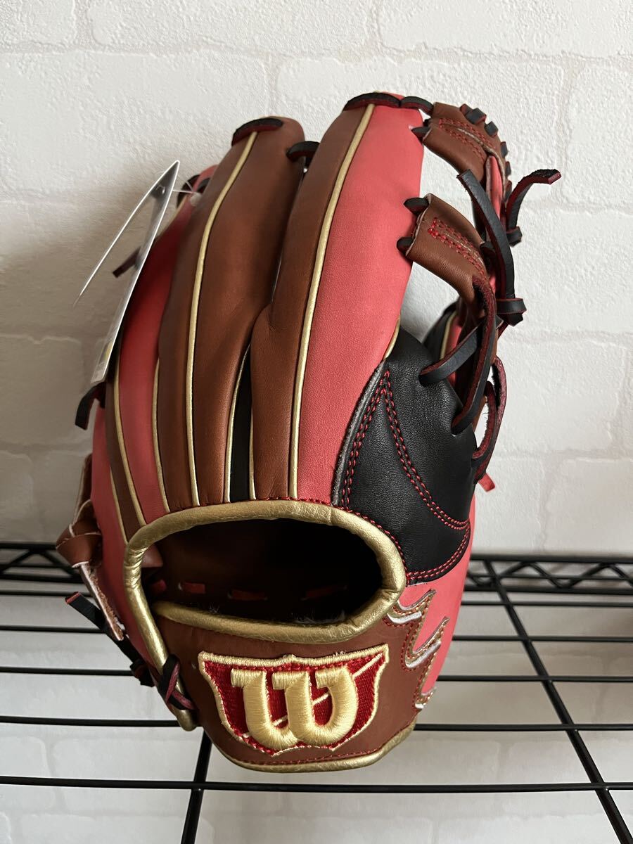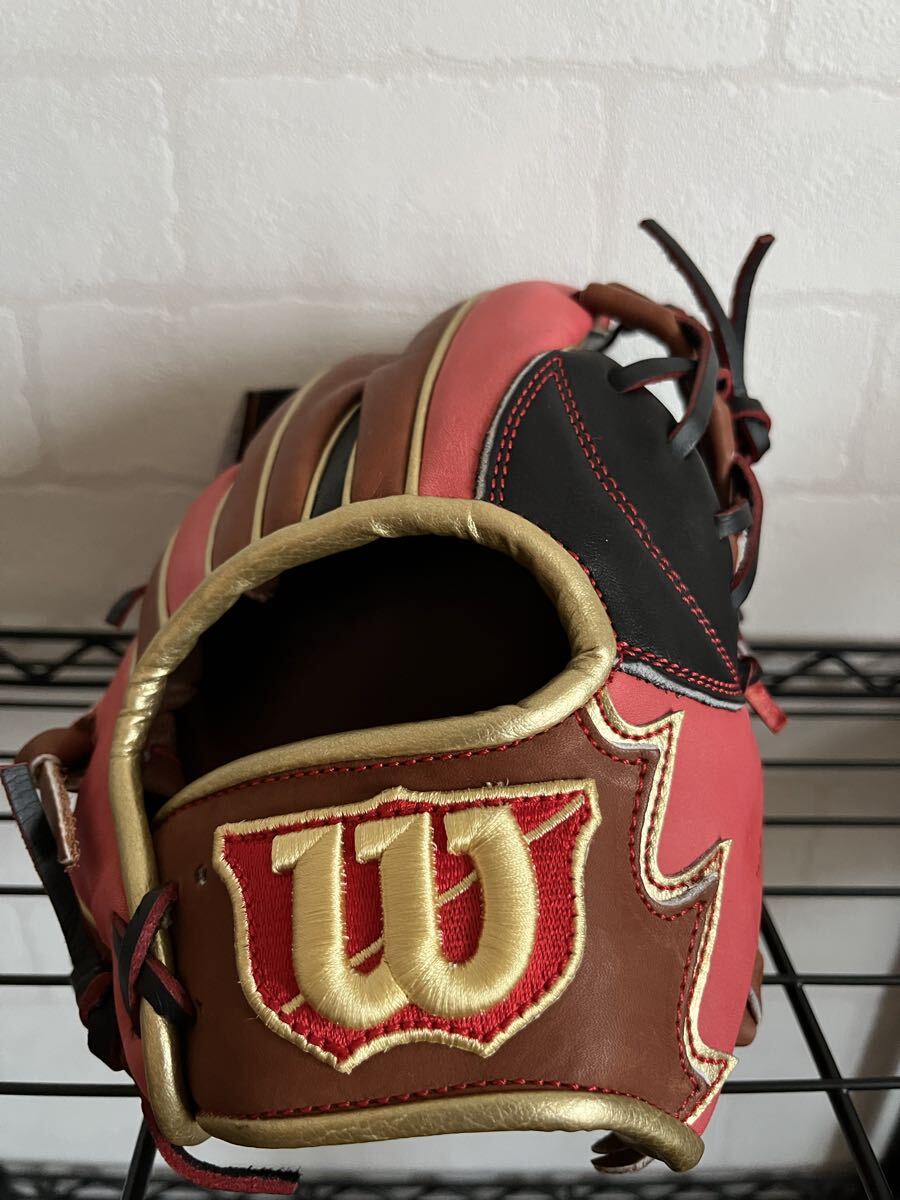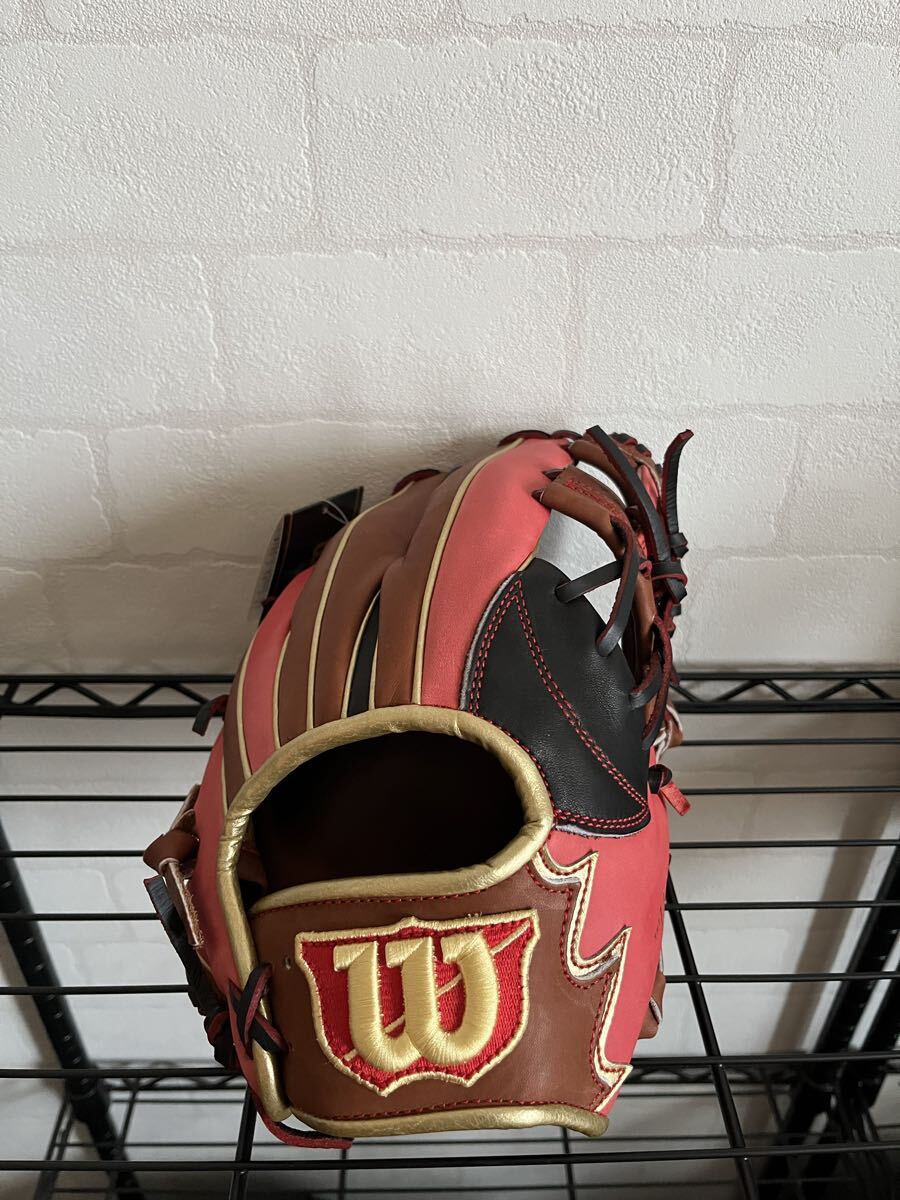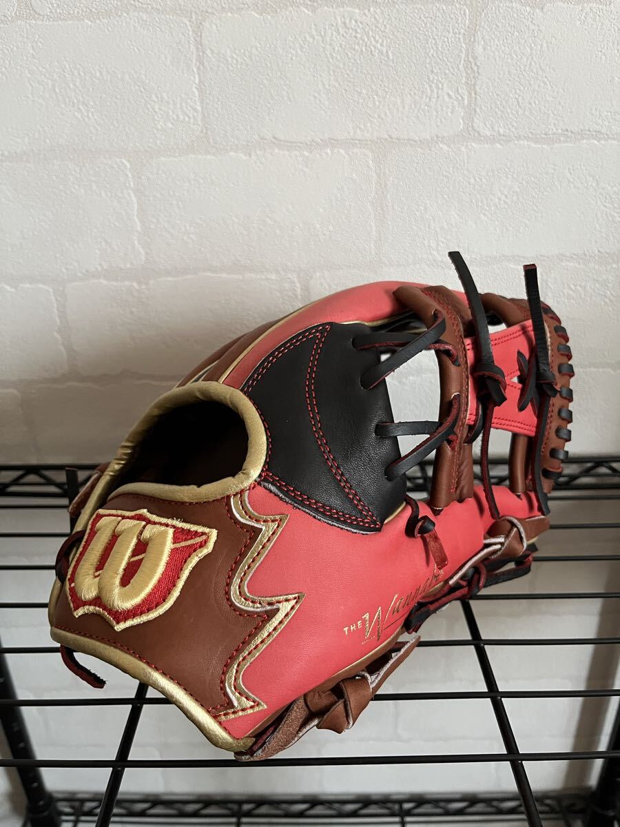 Wilsonの野球グローブです。Wilson The Wannabe Heroシリーズの軟式用グローブで、カラーはレッド、ブラウン、ブラックのマルチカラーです。