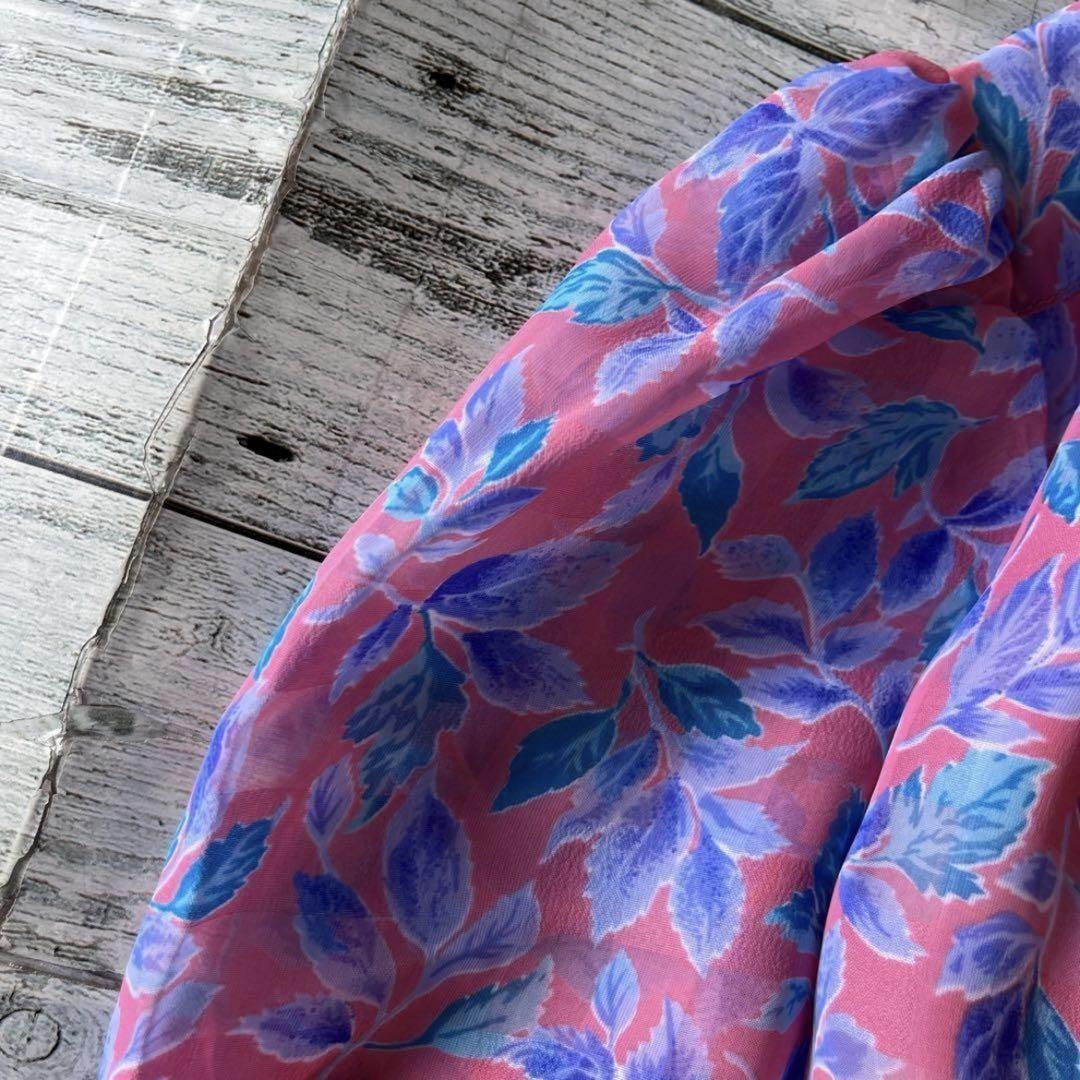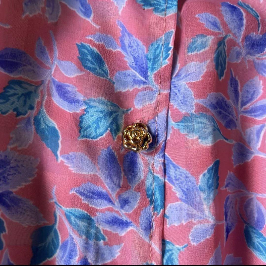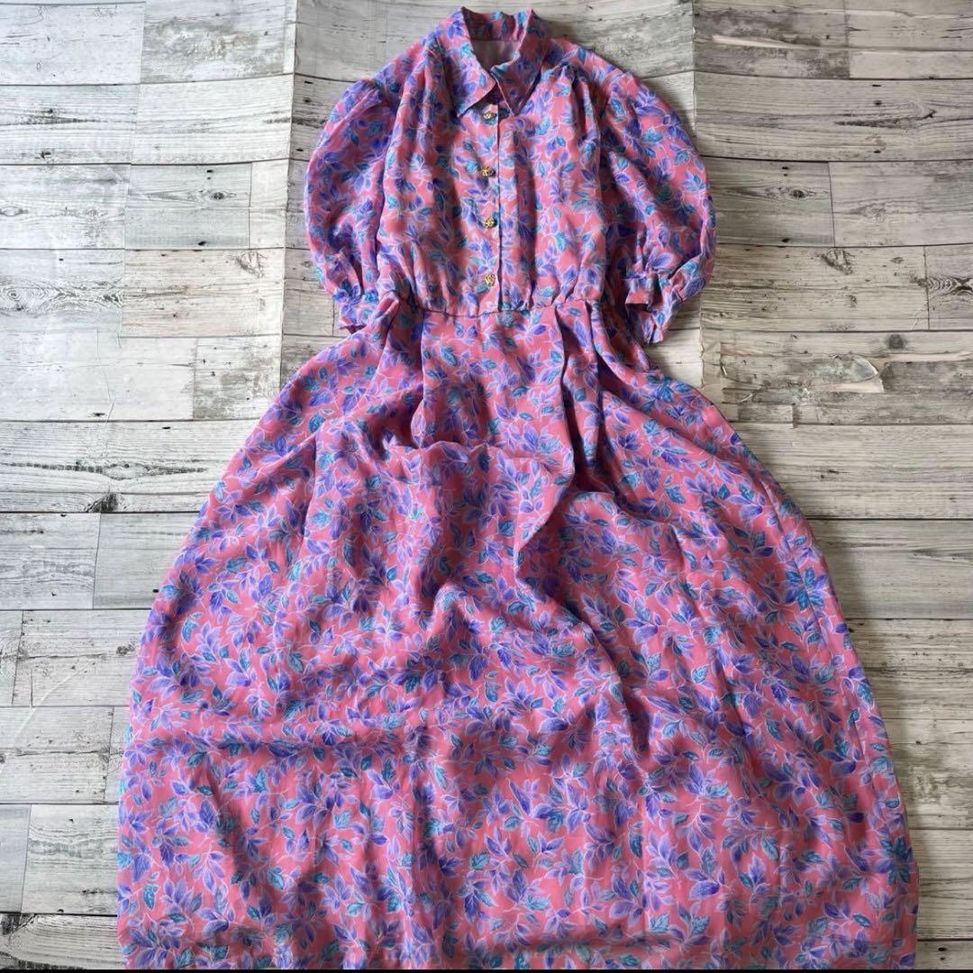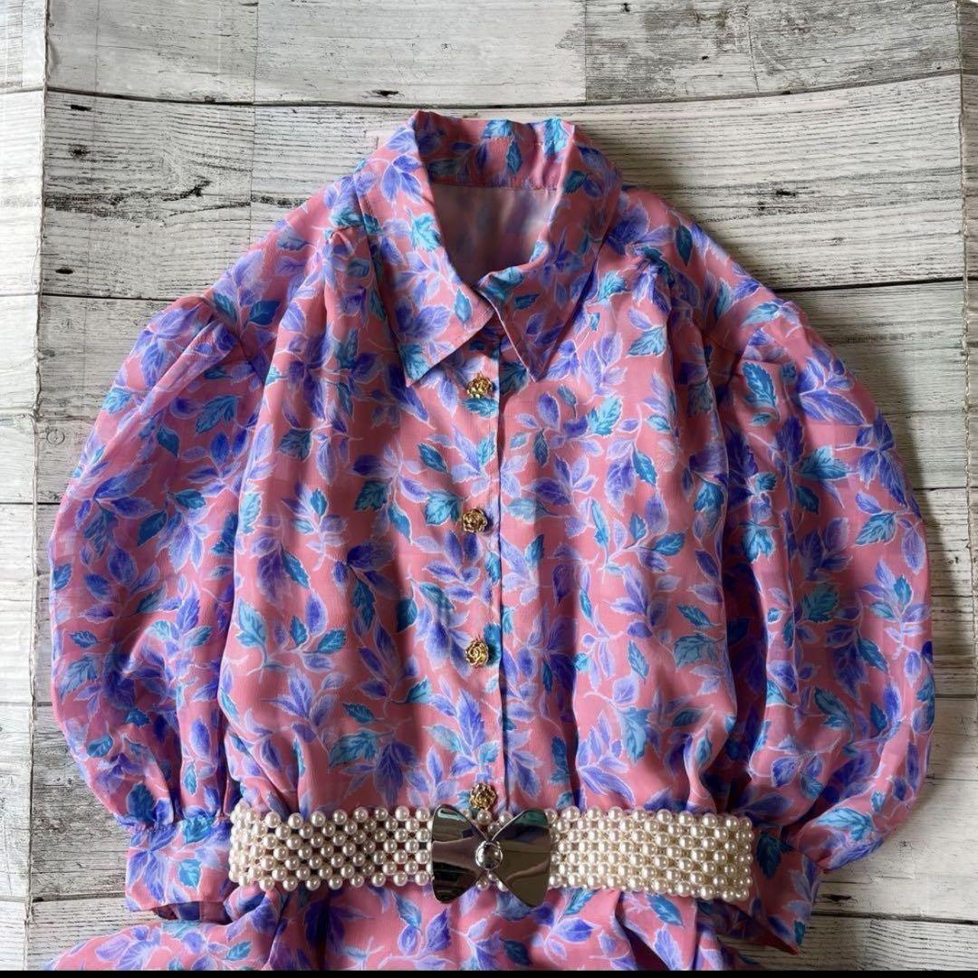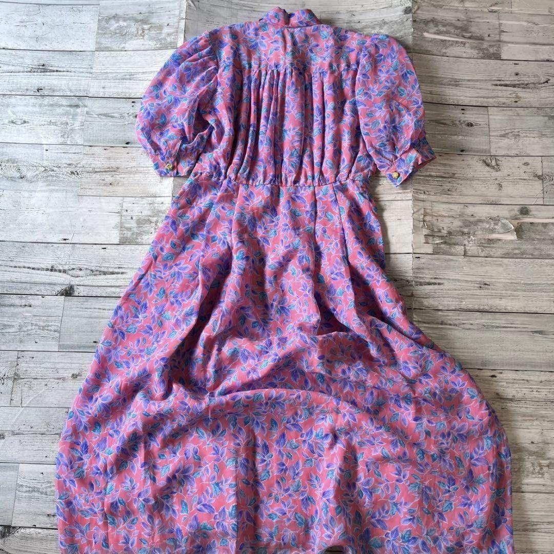ピンク地にブルーのリーフ柄が映える、昭和レトロな雰囲気漂うロング丈ワンピースです。ふんわりとしたパフスリーブに加え、ウエストをマークするパール調ベルトがセットになっており、スタイルアップ効果も抜群。ゴールドボタンが上品さをプラスし、特別な日のコーディネートにもぴったりです。裏地付きで透け感を気にせず着用可能。古着やヴィンテージファッションがお好きな方におすすめです。春夏のお出かけや秋口の重ね着スタイルにも活躍する一着です。
