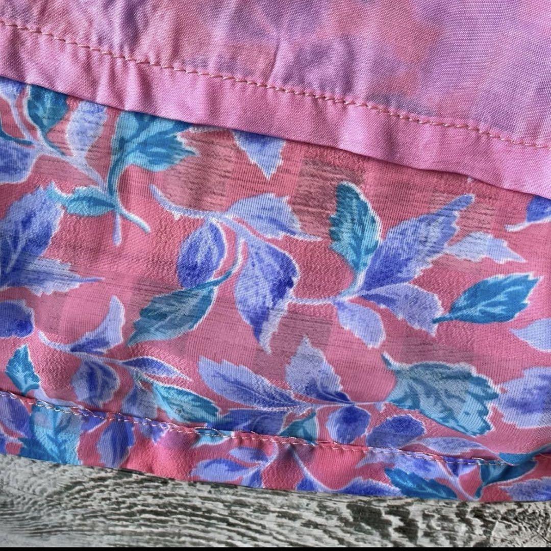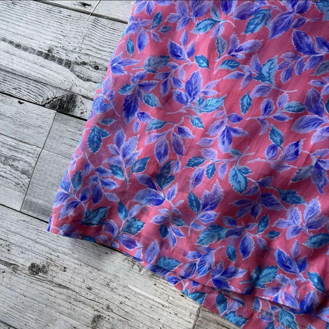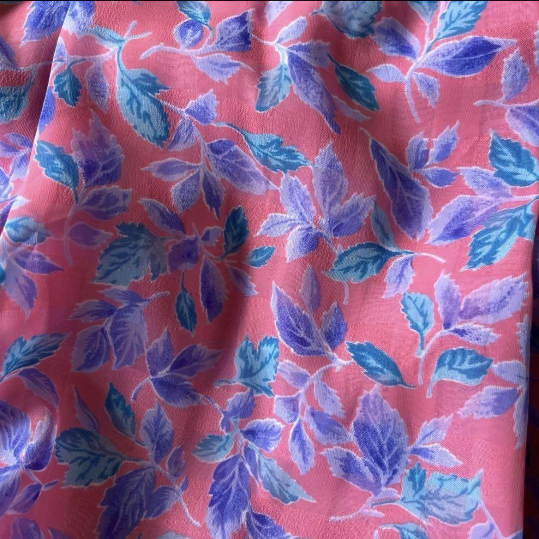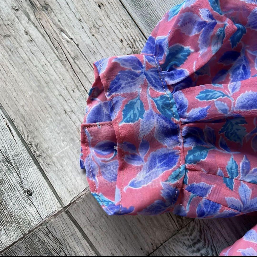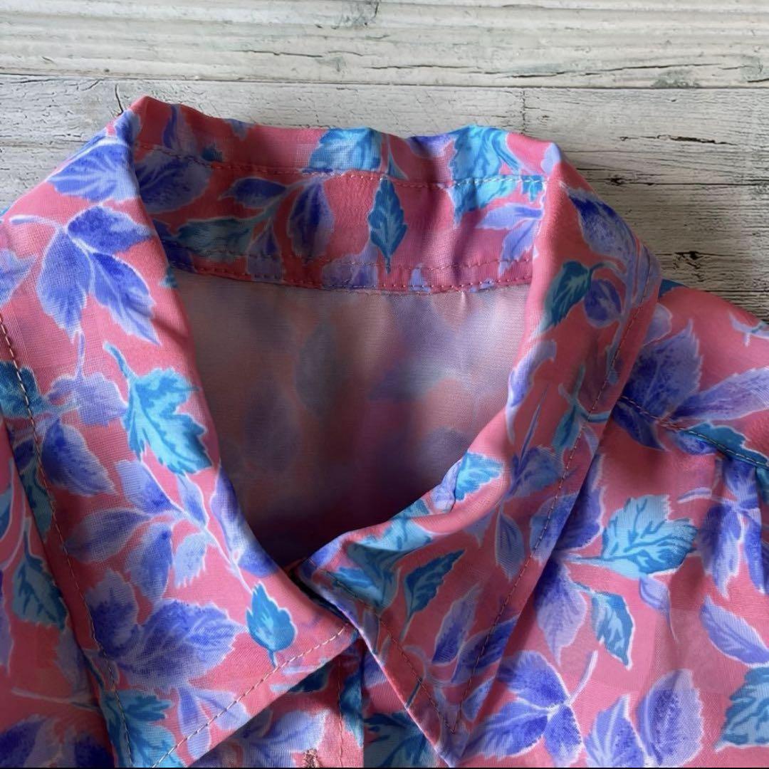 ピンク地にブルーのリーフ柄が映える、昭和レトロな雰囲気漂うロング丈ワンピースです。ふんわりとしたパフスリーブに加え、ウエストをマークするパール調ベルトがセットになっており、スタイルアップ効果も抜群。ゴールドボタンが上品さをプラスし、特別な日のコーディネートにもぴったりです。裏地付きで透け感を気にせず着用可能。古着やヴィンテージファッションがお好きな方におすすめです。春夏のお出かけや秋口の重ね着スタイルにも活躍する一着です。