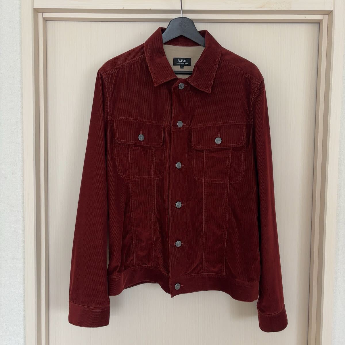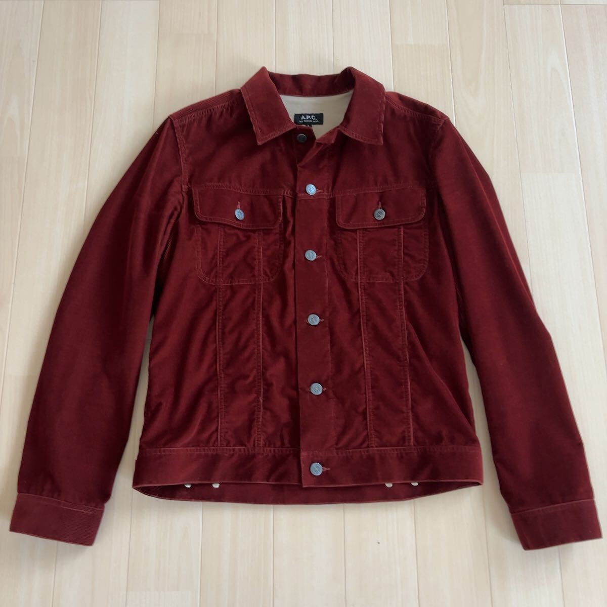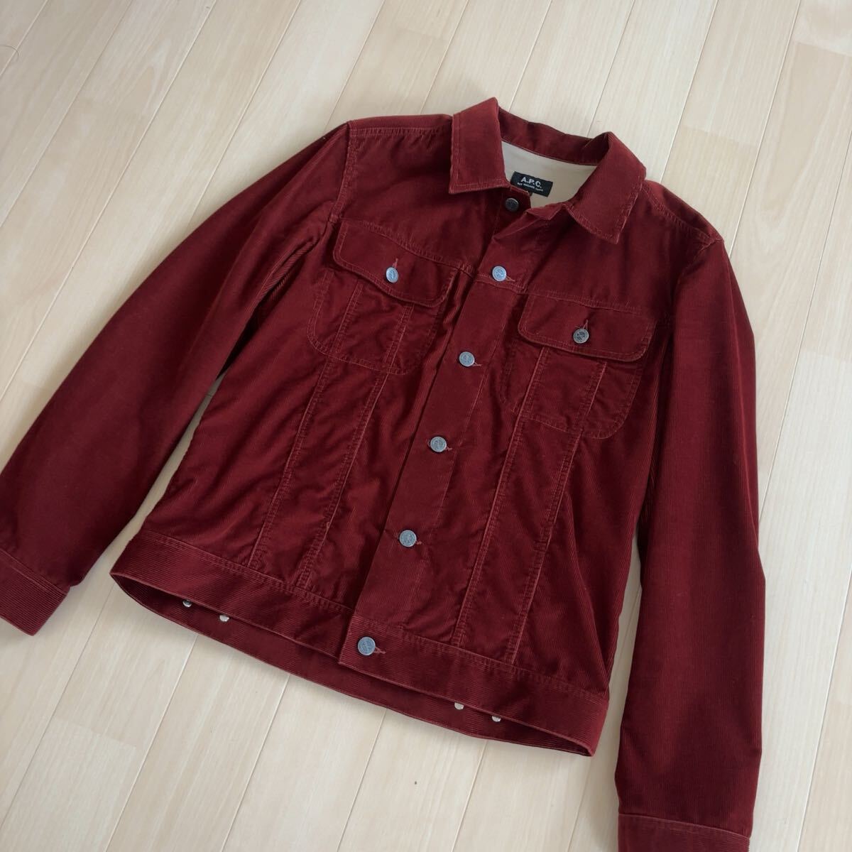 A.P.C.のコーデュロイジャケット、サイズ表記はL、お色はボルドーです。