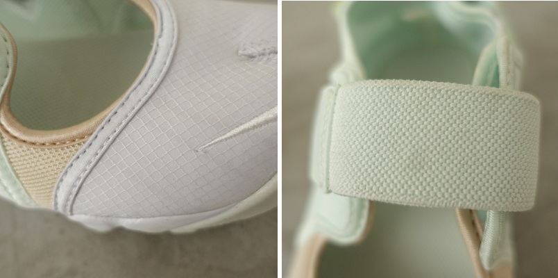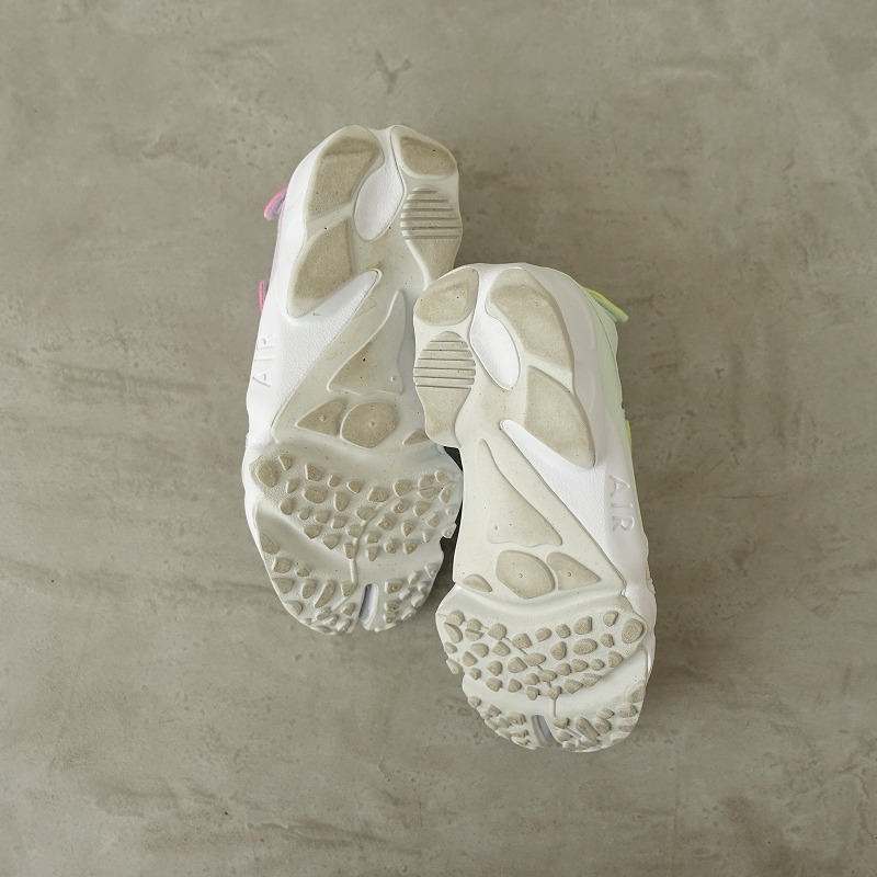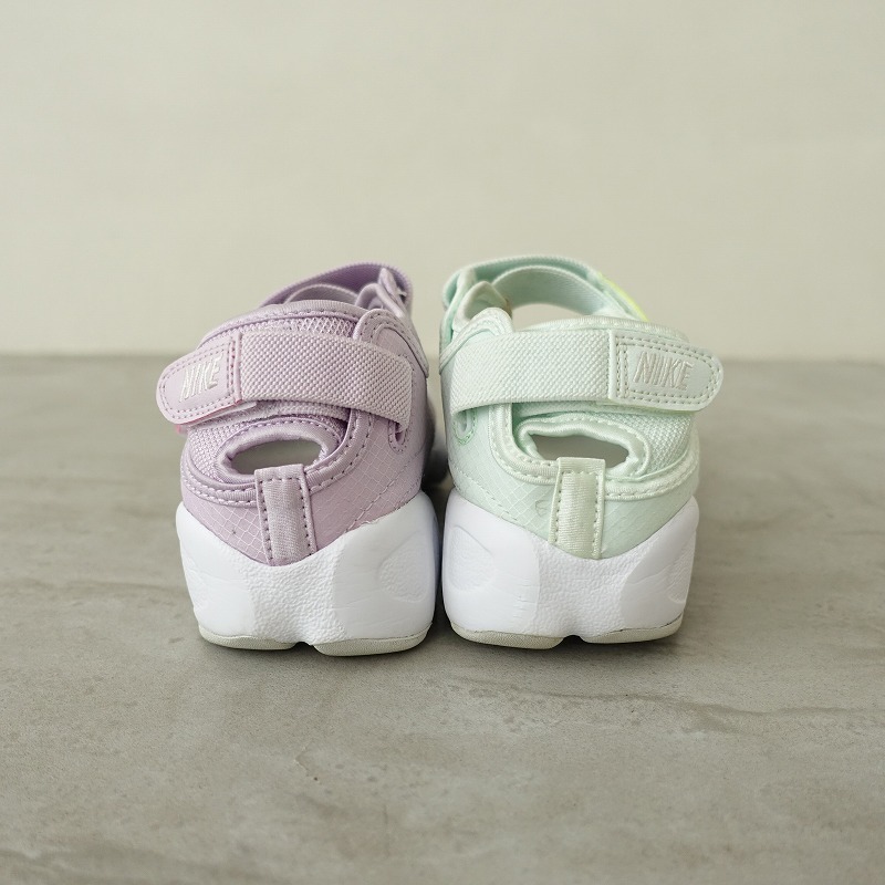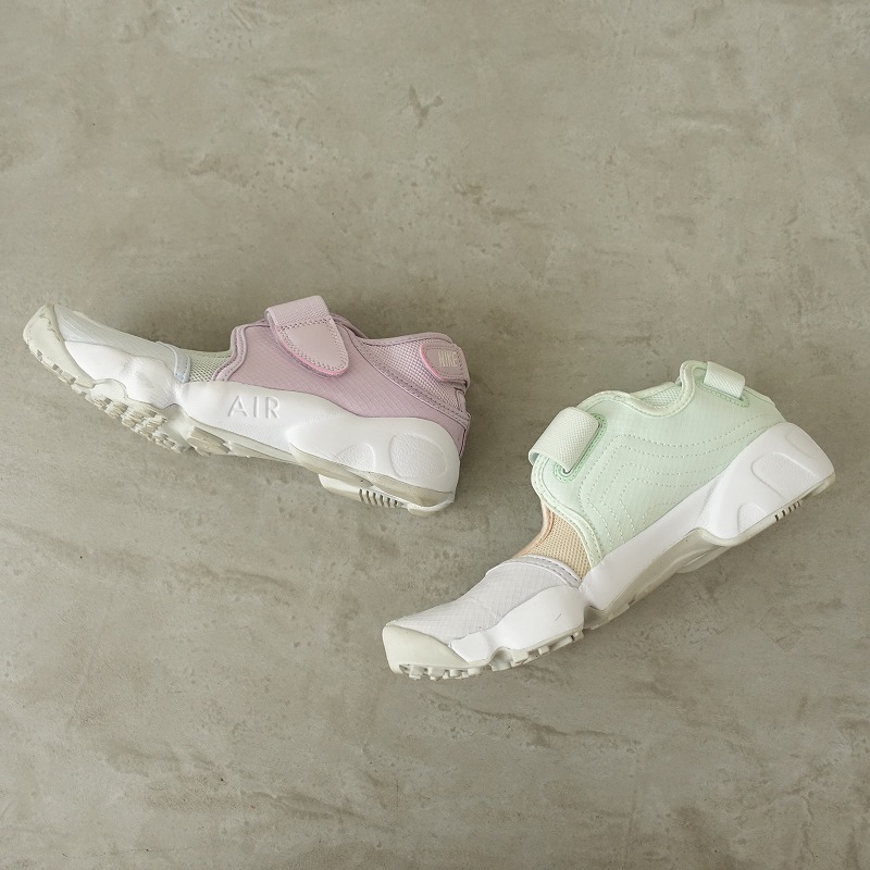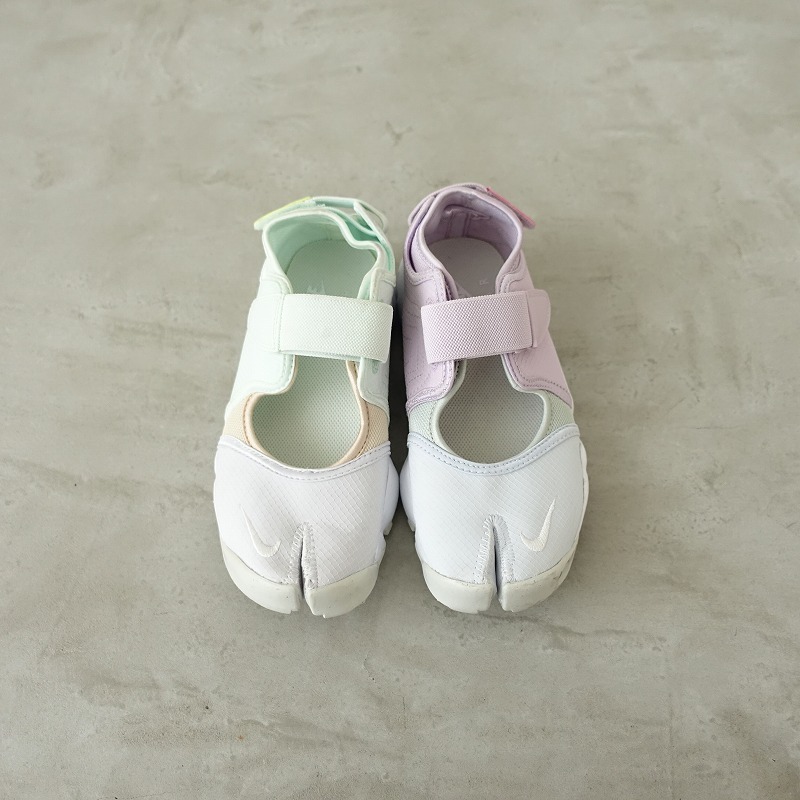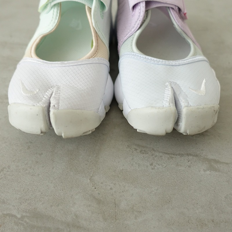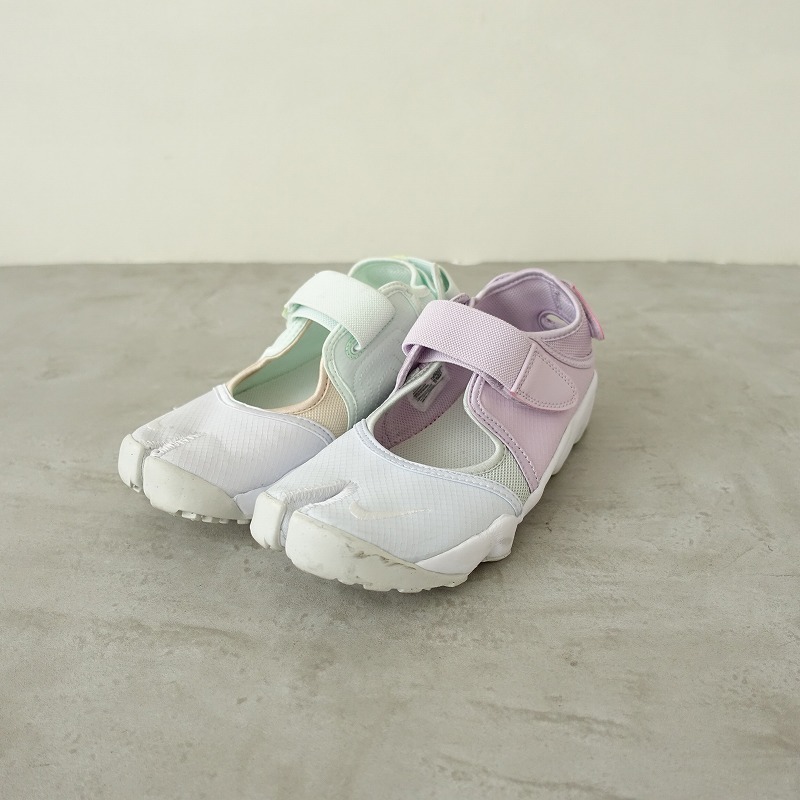 NIKEのWMNS AIR RIFT BR エアリフトです。カラーは白に近いライトグレー・ミントグリーン・ライトブルー・ラベンダーなどで、左右で配色の違うデザインになっており、つま先が足袋のように2つに分かれています。甲部分と履き口後ろのベルクロテープで着脱していただけ、インソールはクッション性がございます。 |
