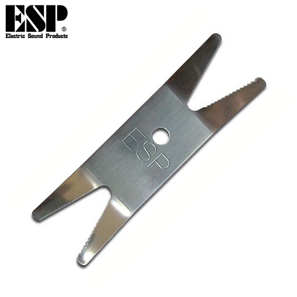 対辺8~18mm、およびギザ付きナットに対応し、ギターやベースに取り付けられたほとんどのナットに使用可能な「ESPマルチスパナ」です。