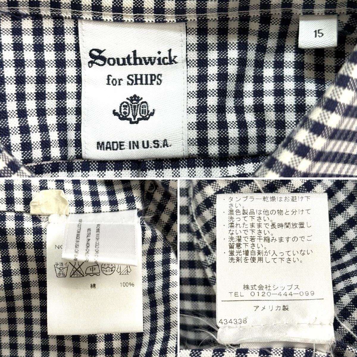 美品 Southwick USA製 SHIPS サウスウィック 長袖 ボタンダウン シャツ ギンガムチェック 青 ブルー シップス 15 M相当