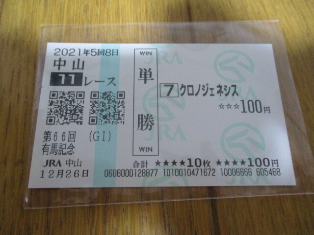 【現地単勝馬券】クロノジェネシス 2021年有馬記念3着 ルメール騎手鞍上 経年劣化有 中山競馬場
