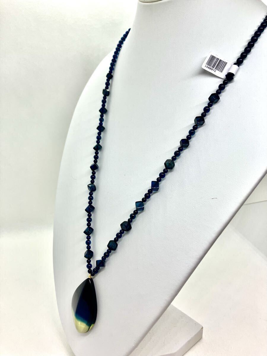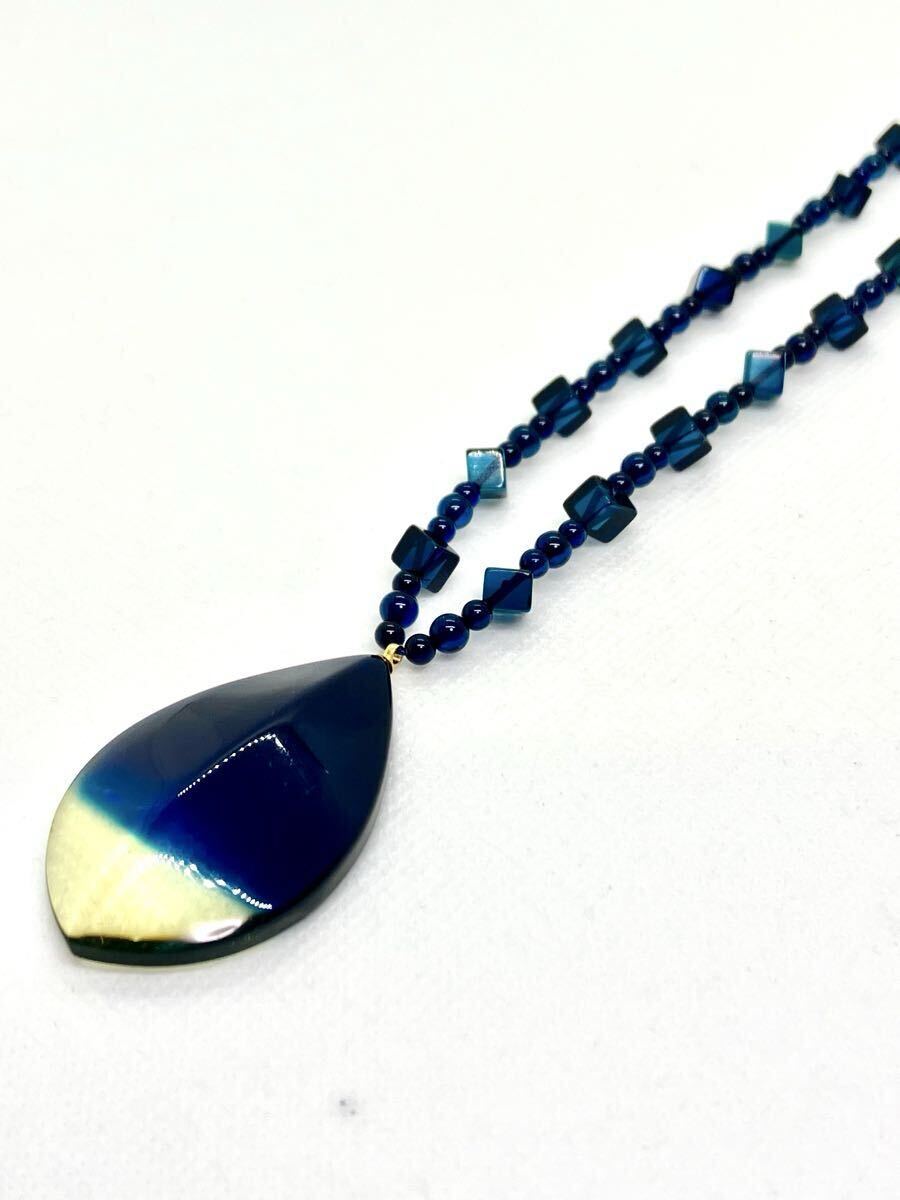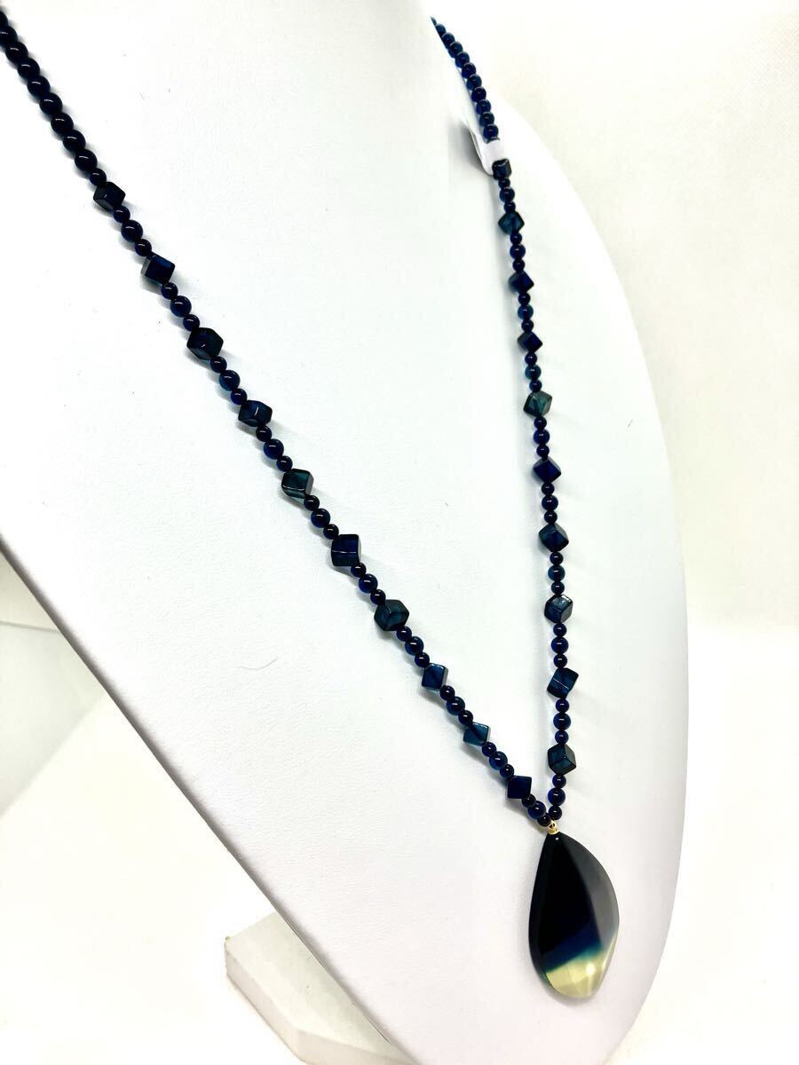 またネックレス部分のブルー琥珀には、大きさの違う丸玉(4㎜、5㎜)や、四角にカットされたブルー琥珀がふんだんに使用され、動きのあるオシャレなデザインネックレスになっております。